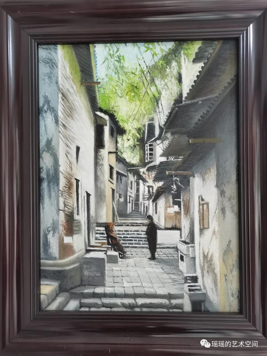 在《山城巷》中,画出轮椅上的老人在女儿陪伴下晒着冬日的阳光,更能贴切地表现出母女的深情,也正是老街巷固有的深情,更显老城中人们生活的恬静和美好。当然,在以前物质条件大不如今的时候,生活在巷中或老城中的人们,仍不缺少生活的真情及邻里间的温情。也许,这幅《山城巷》还会唤起曾经在这里居住过的人们,对往惜邻里间美好生活的回忆。