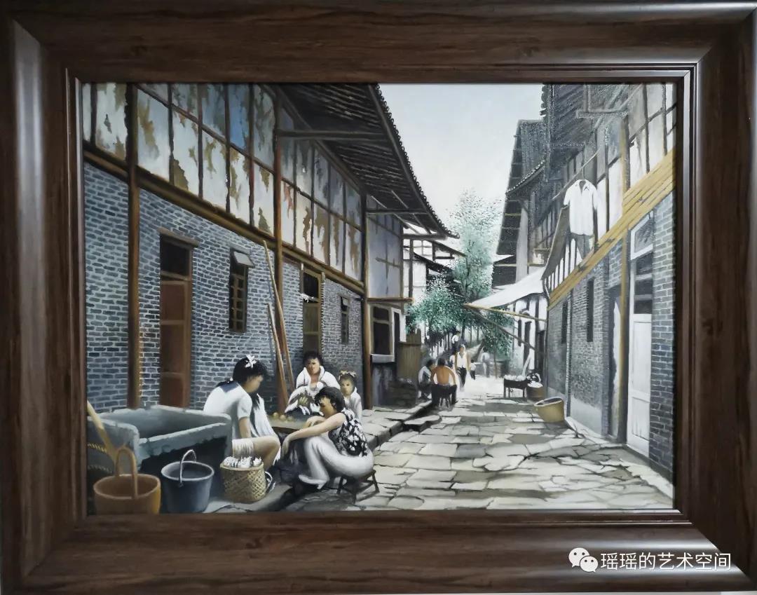 现在的山城步道与山城巷相连,经过一翻修善的山城巷成了网红之地。这也让天官府在睡梦中醒来。很多人知道它,却对其过往知之甚少。不过,人们对过去的往事关注不高,对老城巷的旅游热烈激昂。旧情往事在有些年岁的人心里,就是抺不去的乡愁。 这一幅完整的油画小品,记述的是上世纪七十年代的天官府,或许也是自己儿时的记忆。那门洞里的球场,晒坝.花园都在脑海里挥之不去,这正是曾在这里生活过的人们一样的亲情。