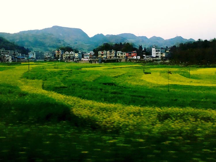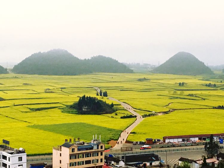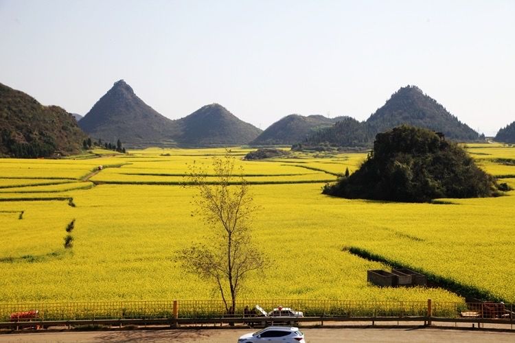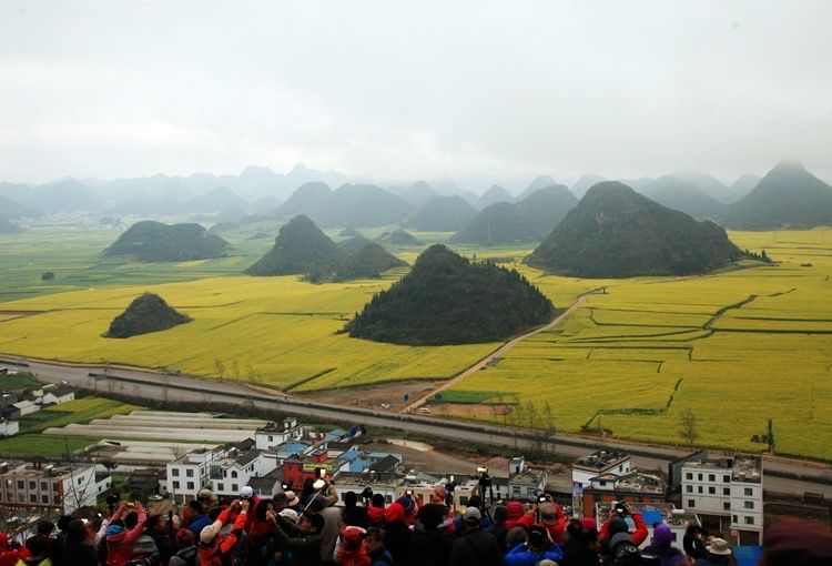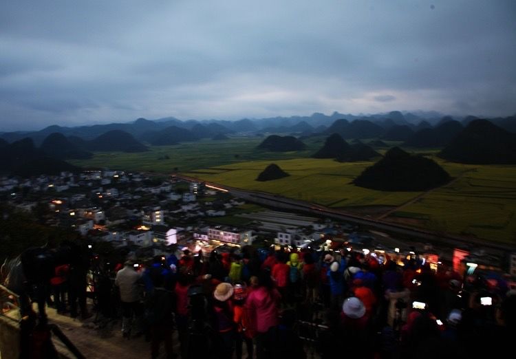 天渐渐亮了,东边天空仍乌蒙蒙。远处的金鸡峰丛尽收眼底。锥状的山尖突兀而起,一座座矗立在黄花丛中,犹如花海中荡漾的岛屿。成片的油菜花无边无际,伸向遥远的天际。很多绝美的油菜花片都出自这里。可惜天气实在不给力,我在山上等了一个多小时,始终没见太阳。这时上山的人越来越多,观景台上水泄不通。我用手机拍了几张片,就匆匆下山了。