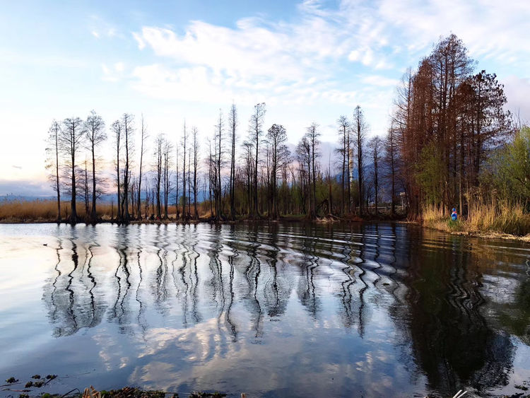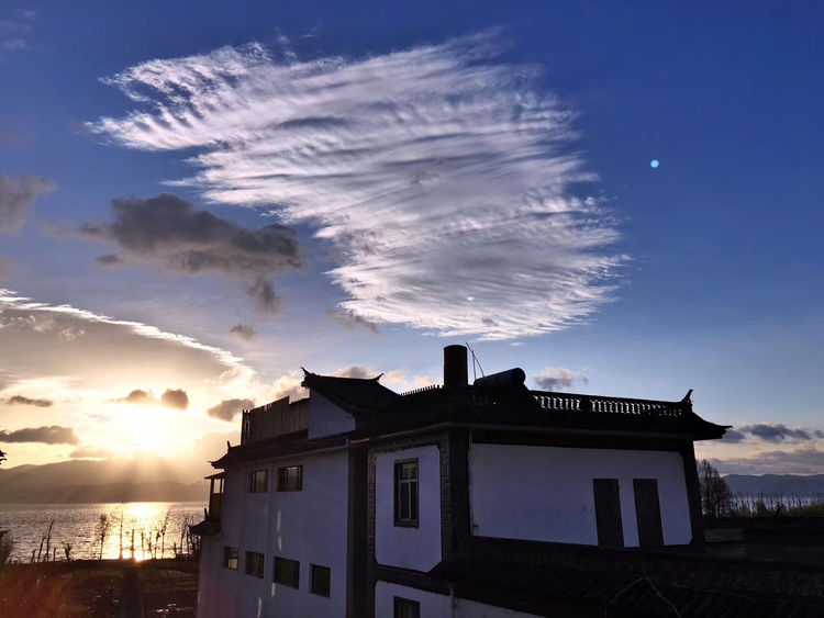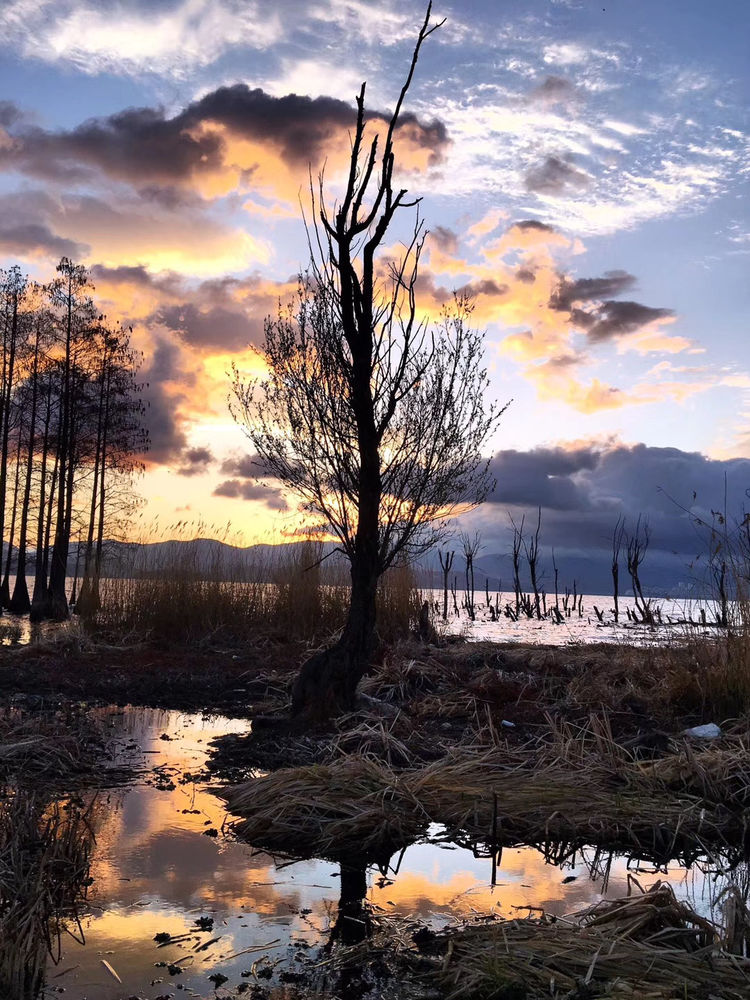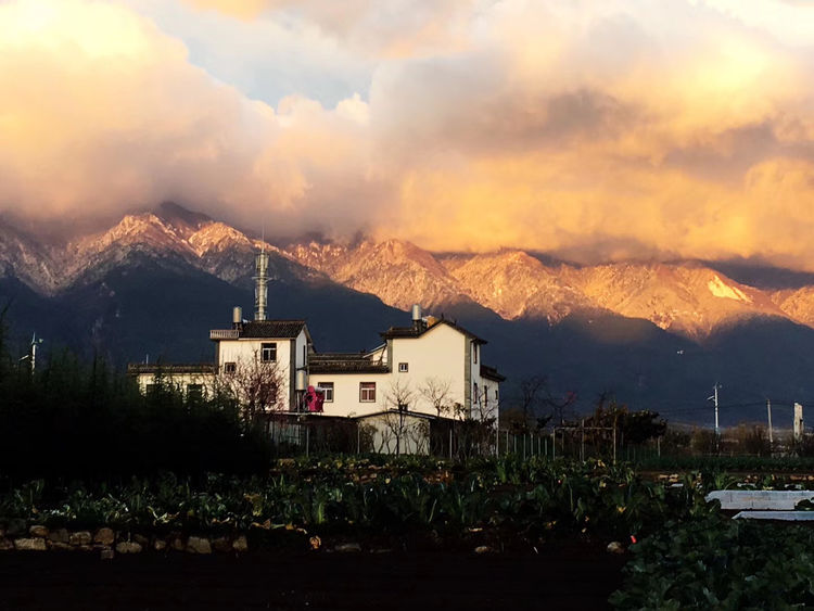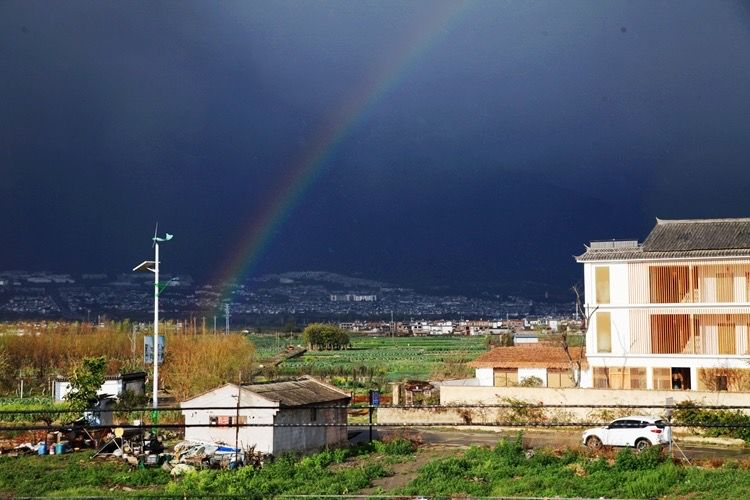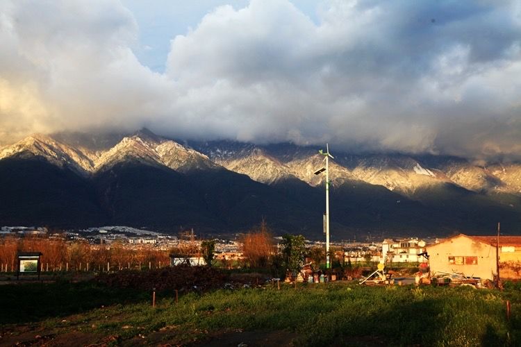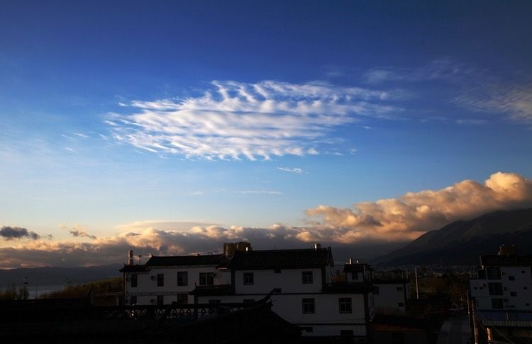 一天清晨,我独自来到洱海边看日出。洱海的早晨,静谧安祥,干净透明的海水宛如一面大镜子,映出天边的彩霞。脚下哗啦啦的水声,耳边叽叽喳喳的鸟叫,天边云彩像是抹了一层浓厚的妆彩,给高高的云彬树镀上了金光。一会太阳穿越云层把洱海映照的波光粼粼,美轮美奂。洱海的早晨太美了,如诗如画,如梦如幻,让人惊艳。我们站在客栈天台,能够直观全景的苍山和洱海,有一天雨后,天空出现了彩虹,后面是苍山雪,那炫目的色彩,悬挂在半空持续了很久,直到慢慢变淡、消失。