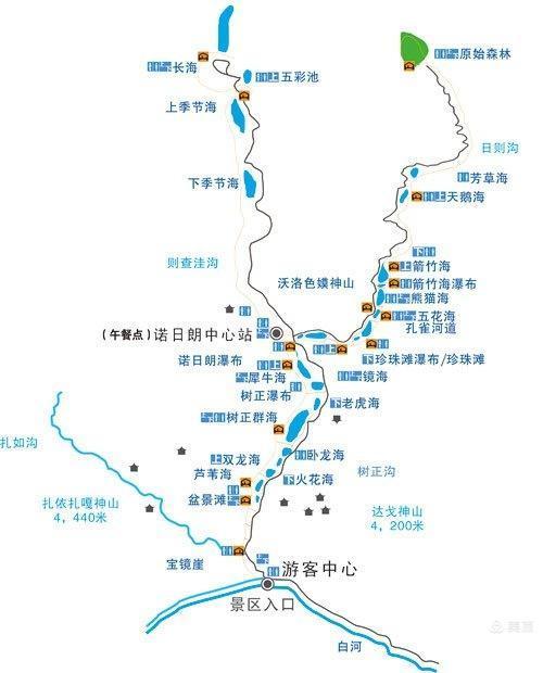 九寨沟景区景点由则查洼沟、日则沟、树正沟三条主沟形成“Y”形分布,总长度约60余公里。