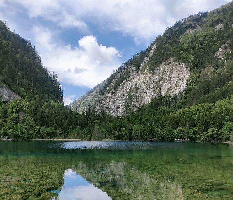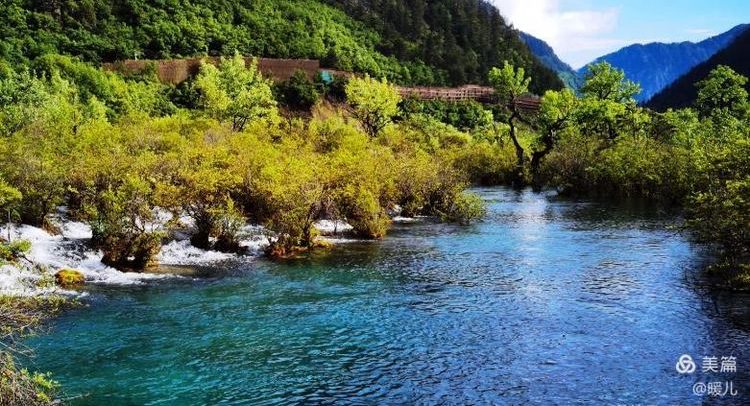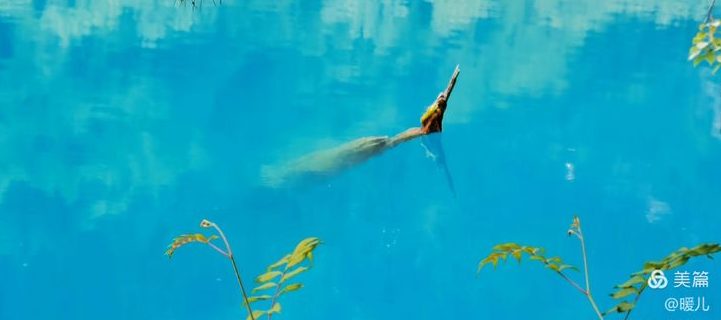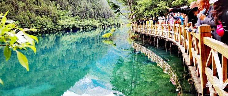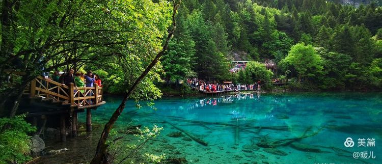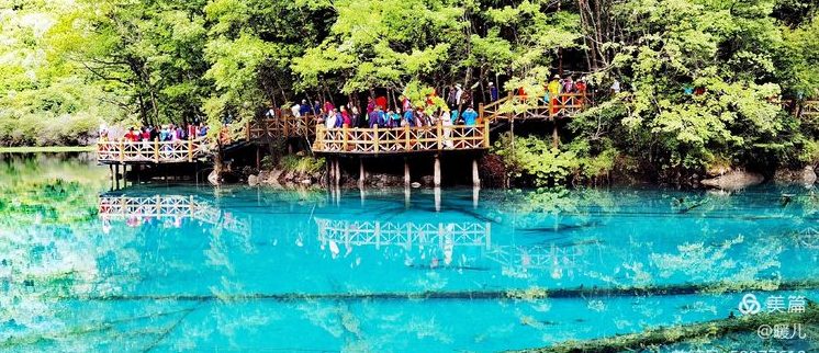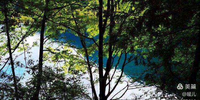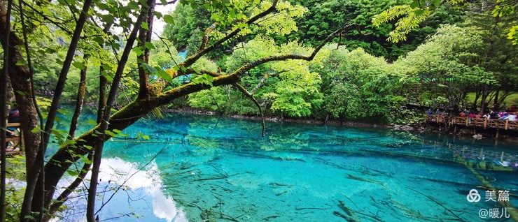 在九寨沟,水是透明的,将天、山、树还有人,全都倒映了出来;水是宝蓝的,宛如远方的大海、万里无云的天空;水是清澈的,池底的悬木,上面长着的苔藓,都露的清清楚楚,根根分明。