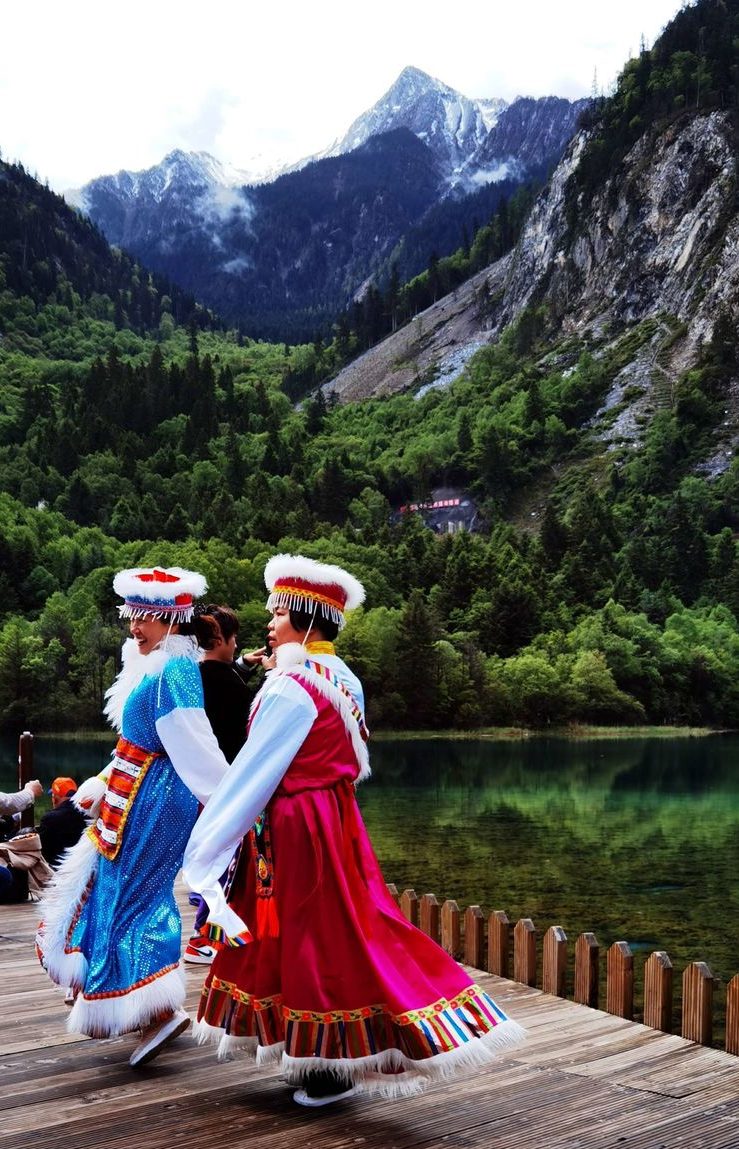 五彩池旁有很多出租藏族服饰的藏人,好多女性穿上歌舞留影,体验藏族风情。