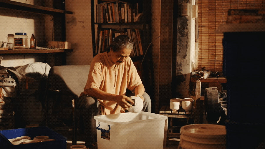 陈九骆20多岁时就很欣赏陶艺之美,工作之余,经常去找老师傅学拉坯,也学过釉药。