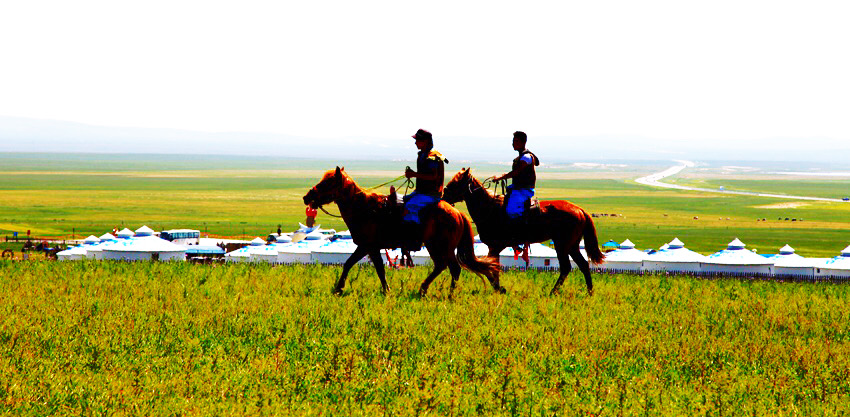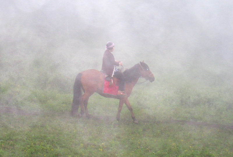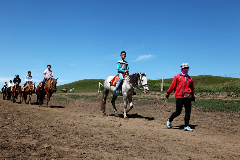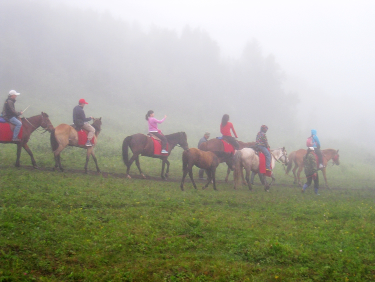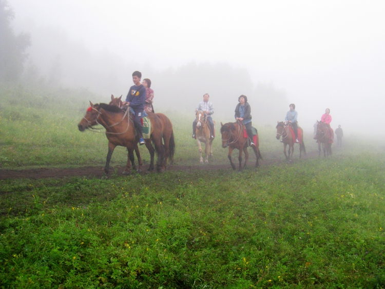 草原的早晨白雾弥漫,清脆的马蹄声来到近前,大家骑上马跟着牧人向草原深入走去。我的坐骑是一匹白马,牵马的是一个十六七的女孩子。我有过一次骑马的经历,比那些没骑过马的人稍安静点。大家骑在马上闹腾腾,有的喊害怕,有的呼停。特别是带儿童的家长,把孩子搂在胸前,牵着马绳慢腾腾的赶路。所以这支队伍战线拉的很长。我问牵马的小姑娘,为什么家长不来?小女孩说:今天是星期天,学校放假,所以替家长来牵马。