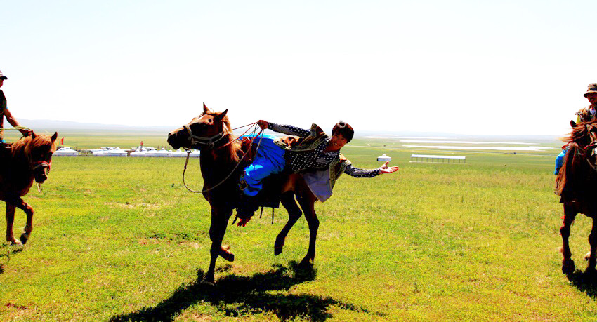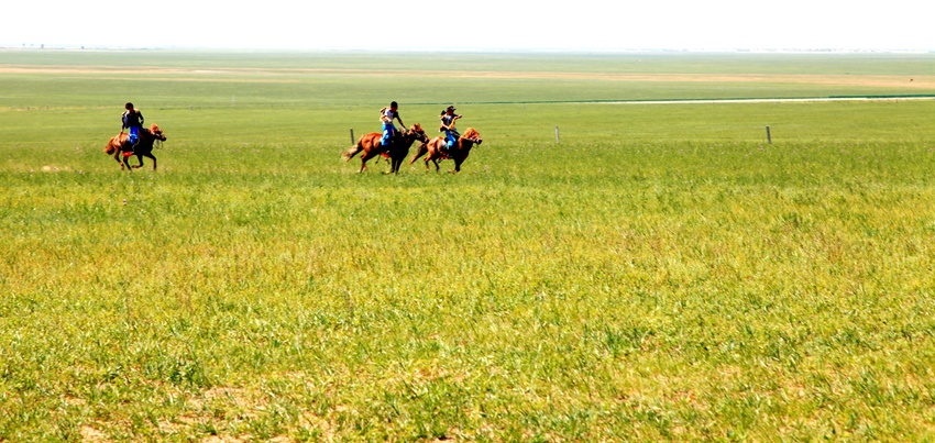 后来,我又多次去草原,每一次都首选骑马。有一年我在坝上巧遇那达慕大会,其中最好看的是赛马,场面非常壮观。选手是清一色的少年,身穿华丽的服装,头缠鲜艳的头巾,扬鞭跃马,你追我赶,欢呼声,马蹄声,响作一片,激荡着蓝天白云下的绿色草原。蒙古族素有马背民族之称,他们世代生活在草原,长期的游牧,狞猎和征战,形成了善骑善射,勇猛骠悍,崇尚英雄的民族习惯。可惜当时我不会拍照,没有留下影像。后来,我去呼伦贝尔大草原,又见识到了少年骑手的英姿。这几张图片就是那时候拍的。