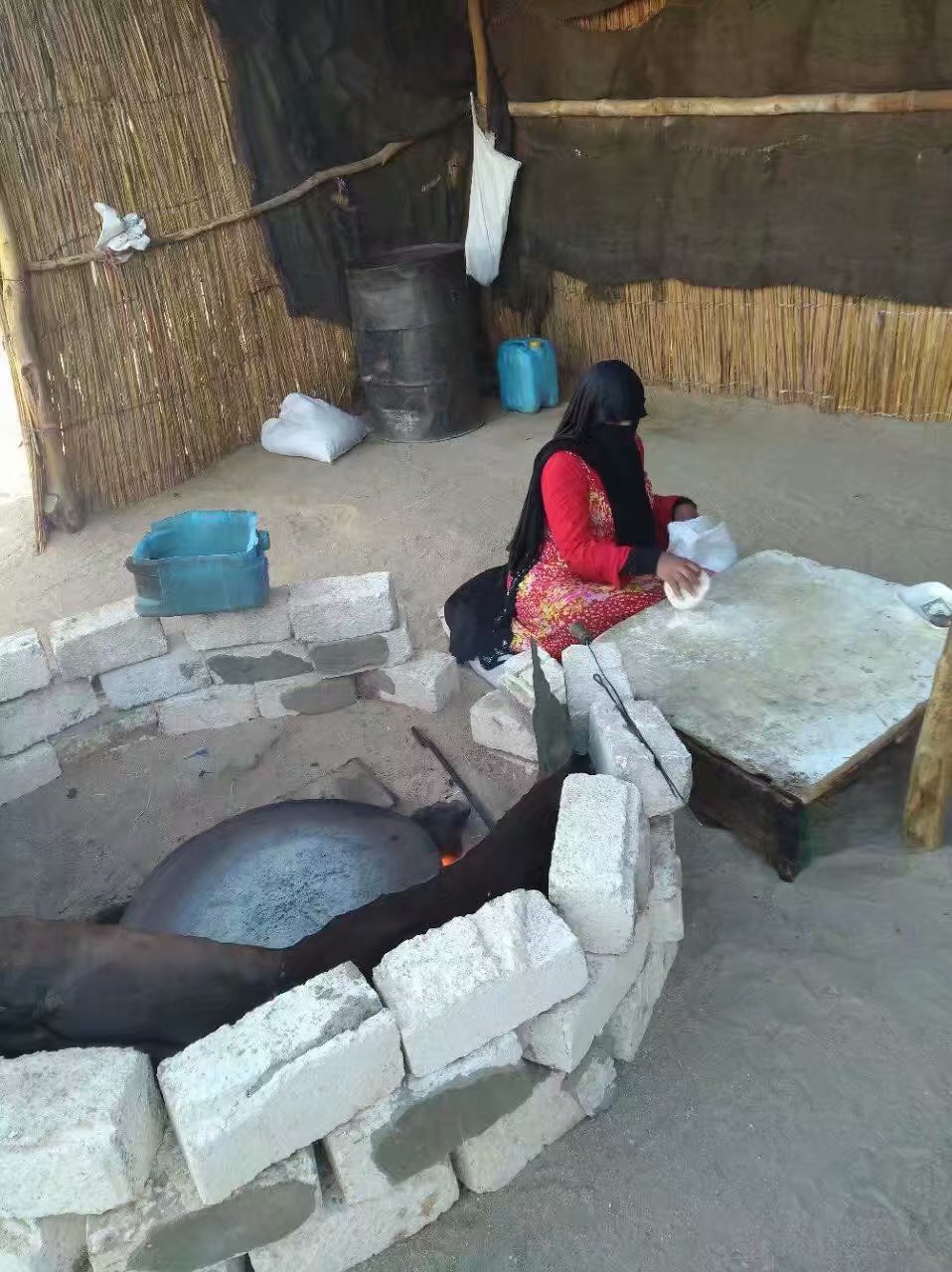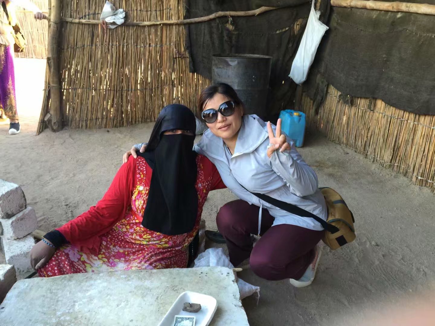 转身走到另一边,一位穿着红色长袍披着黑色头巾的女子映入了眼帘,同样包裹着非常严实,只露二只眼睛,包裹下的神秘使我们产生了极大的好奇,她的年龄、是少女还是妇女?终于在埃导的话语中使我们了解一些,蒙着脸部的一般是未出嫁的姑娘,要是谁把她的面纱摘下了就要娶她为妻了,埃导开玩笑的说“我可不敢去撕她的面纱,不然我要娶她了。。。。。。”玩笑间也让我们找到了答案。女人点燃骆驼粪给我们烙面饼,在这荒芜草木,人迹罕见的大沙漠里,以这样的方式招待我们,也许是给我们最高的礼遇了。我们队友每人撕下一小块尝尝招待客人的食品,且清香酥脆,并在她身边的盒子上每人放上了小费:一美元或20埃镑,我由于没有零钱,干脆放了10元人民币,和她合了个影,让我记住这位给我们烙面饼的红衣少女,也称为撒哈拉姑娘!