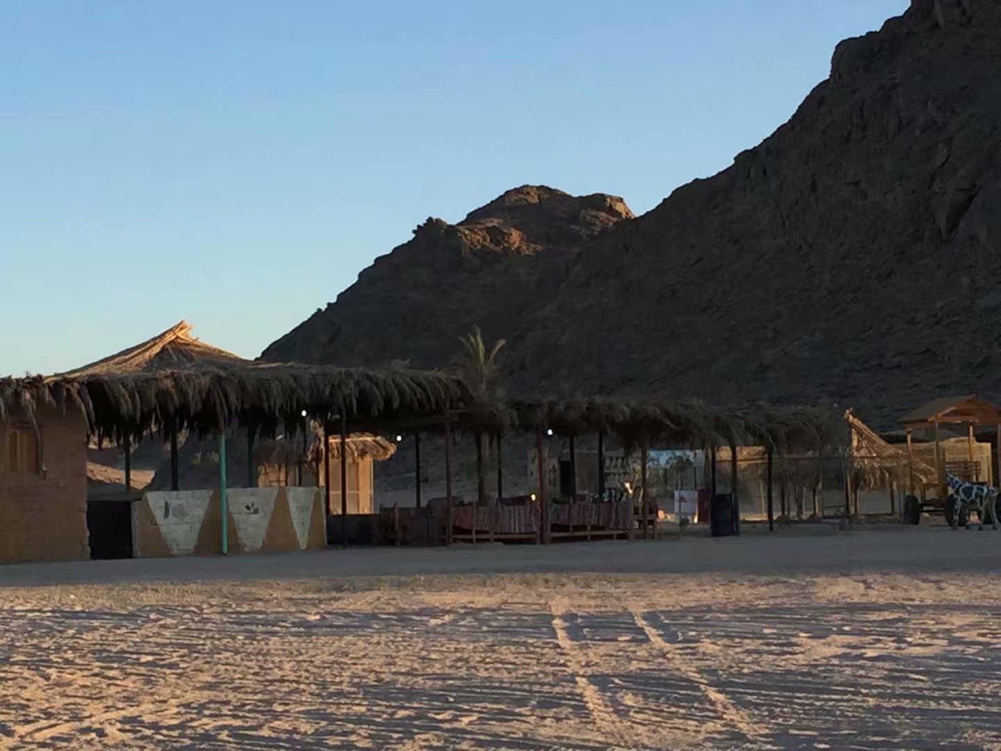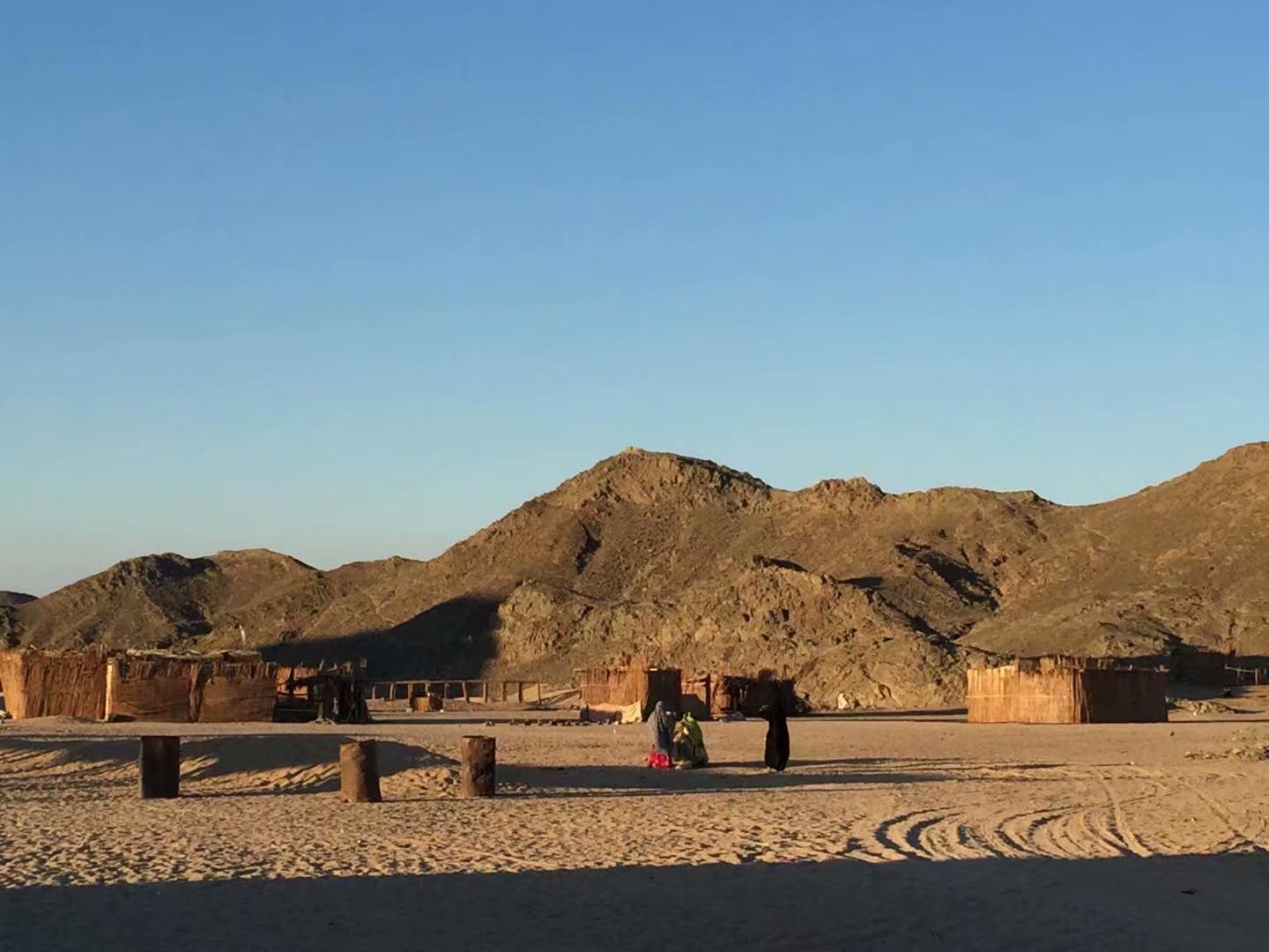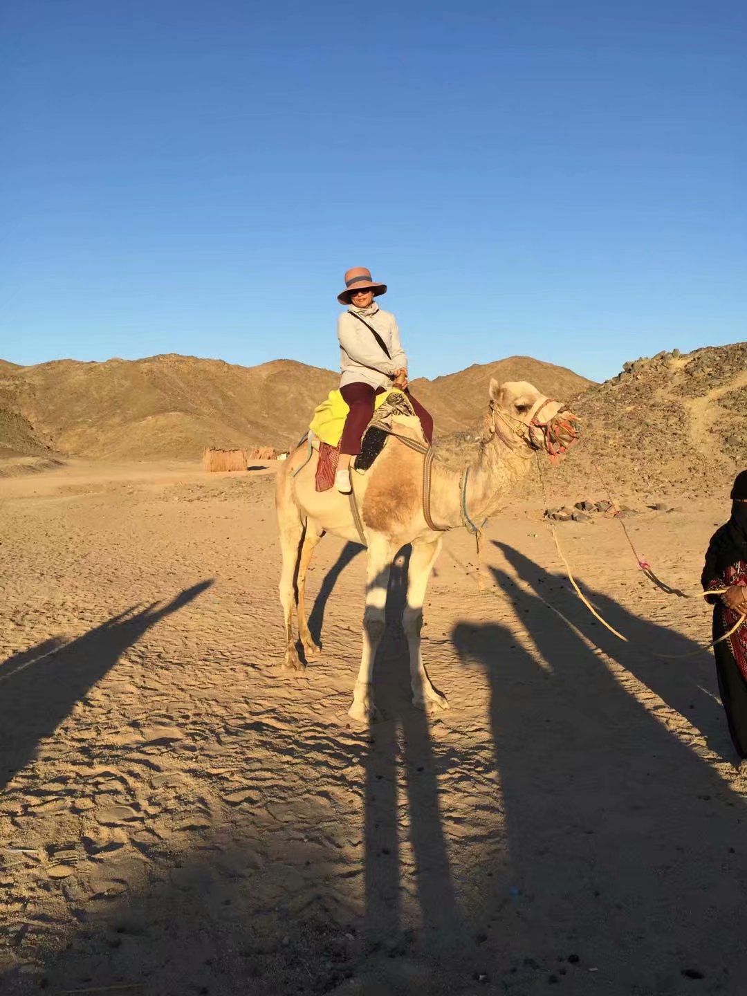 时值黄昏我们兴冲冲的走进了这个部落,听埃及的领队说“这里最早是二户人家,繁衍了子孙后代,代代相传,由于近亲结婚,这里的80%的男人都是哑巴”可想这是一种怎样的悲苦生活?进入这个部落就看见一边有儿童妇女牵着骆驼嘟嘟嚷嚷的吆喝着生意,实在不忍让黝黑而清澈大眼睛,衣衫有点破旧的七八岁儿童给我们牵骆驼,犹豫间走来了像是接待总管似的人推荐了我们成年人的坐骑,坐在高高的骆驼背上,看着全身包裹着严严实实只露双眼的黑袍女子,心里猜想着是什么样的人物,是已婚、未婚?长得好看吗?太神秘了!看到没有做成生意的儿童是那么的落寞无奈,没有接到生意是否会影响到他她们的生活?想想心里总不是滋味。。。。。