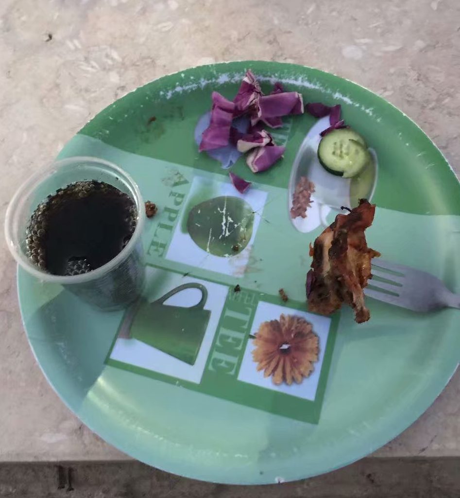 沉思中被领队递送的芒果汁所打断,原来埃导和司机黑暗中忙着给我们倒果汁,让我们品尝埃及新鲜而浓浓几乎都是果肉的芒果汁,浓浓的、甜甜的、凉凉的沁人心脾的味道让人意犹未尽。喝完果汁,埃导和司机忙着收拾喝完果汁的空杯子和空瓶子,不让这些废物留在沙漠中,可想他们的环保意识是比较强的。而我乘着有空杯子剩余,在经过埃及导游和司机的许可下装了满满的一杯子的撒哈拉沙子把它带回中国留作纪念。