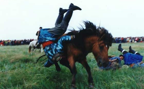 比赛开始,铜锣一响,三名骑手如离弦之箭飞驰向前,只见爷爷一马当先,人马相知,马随人去。到了西瓜地前,一声咳嗽,那马儿完全领会了主人的意图,立马停在一个大西瓜前,爷爷人不下马,左脚着立于马蹬,右足盘在马鞍,倾身向下抱起西瓜,转向回身,领先献瓜。从此,乌兰奥其尔爷爷被公认草原第一骑手,王爷赏给他一条精制的马鞭和一头腱壮的黄牛。