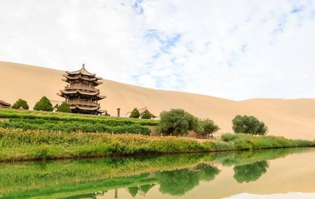鸣沙山有流沙积聚而成,月牙泉因外形酷似一弯新月,故名“月牙泉”。千百年来不被流沙淹没,不因干旱而枯竭。