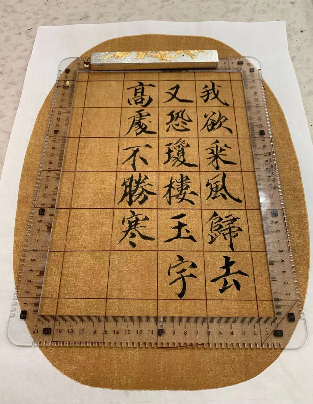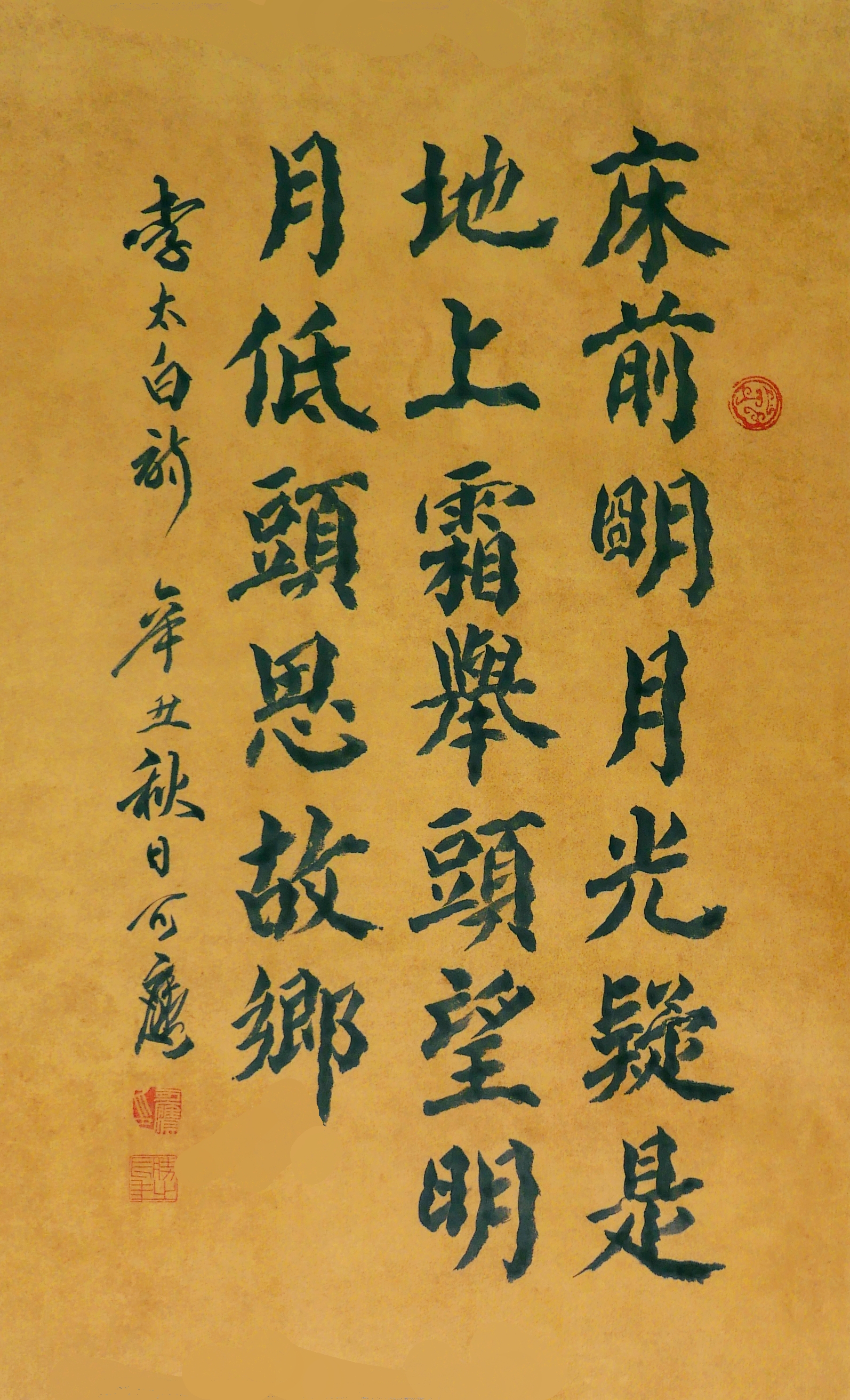 唐 . 李白《静夜思》几乎童叟皆知,今早以颜真卿楷书在仿古绢面上书写一遍。