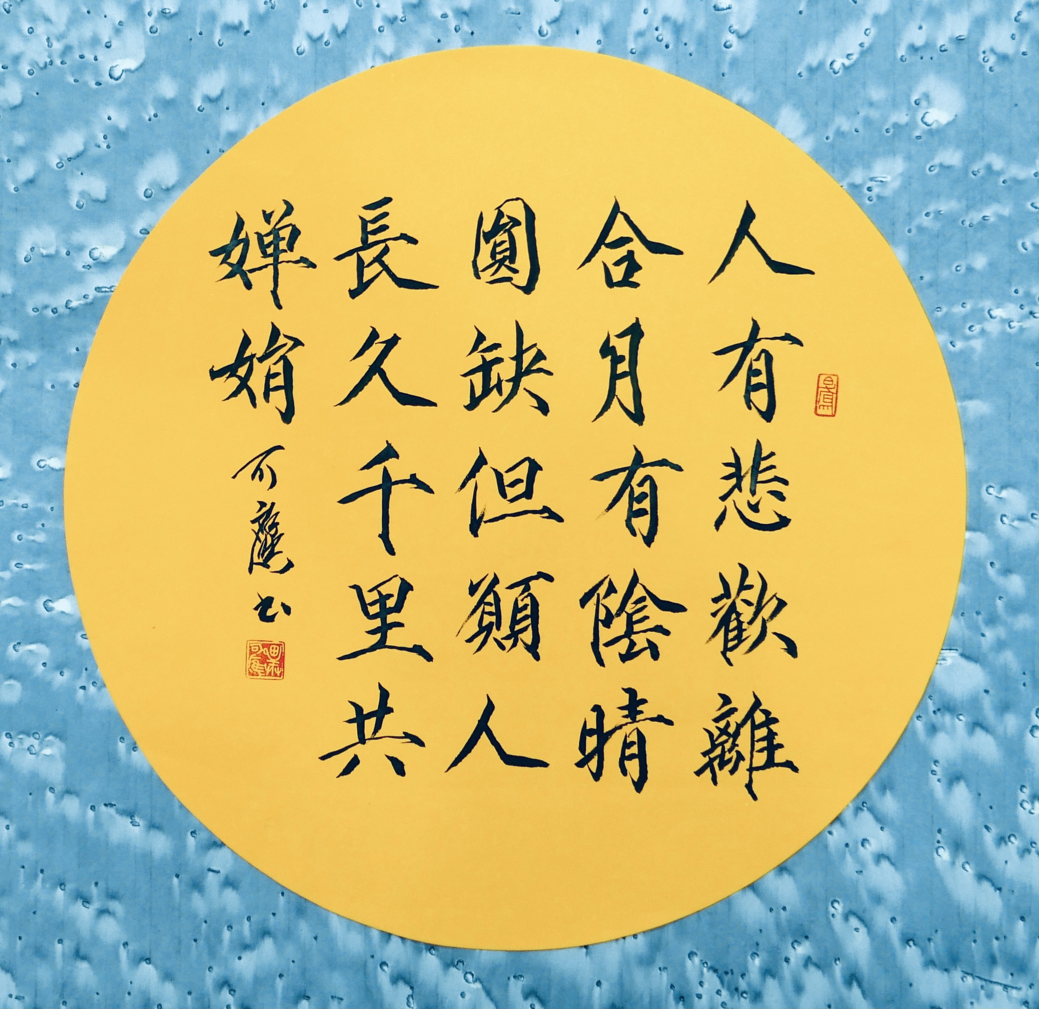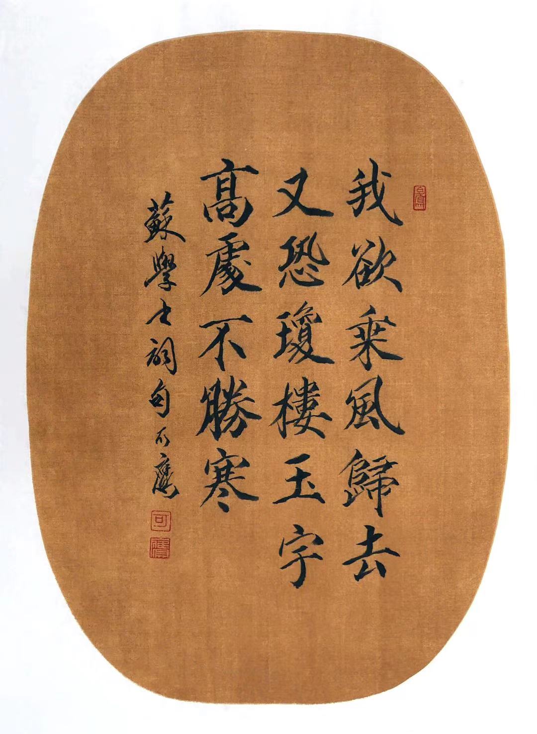 9月6日,在仿北宋的圆形扇面上用徽宗天子的瘦金体书宋 . 苏轼《水调歌头》词句。