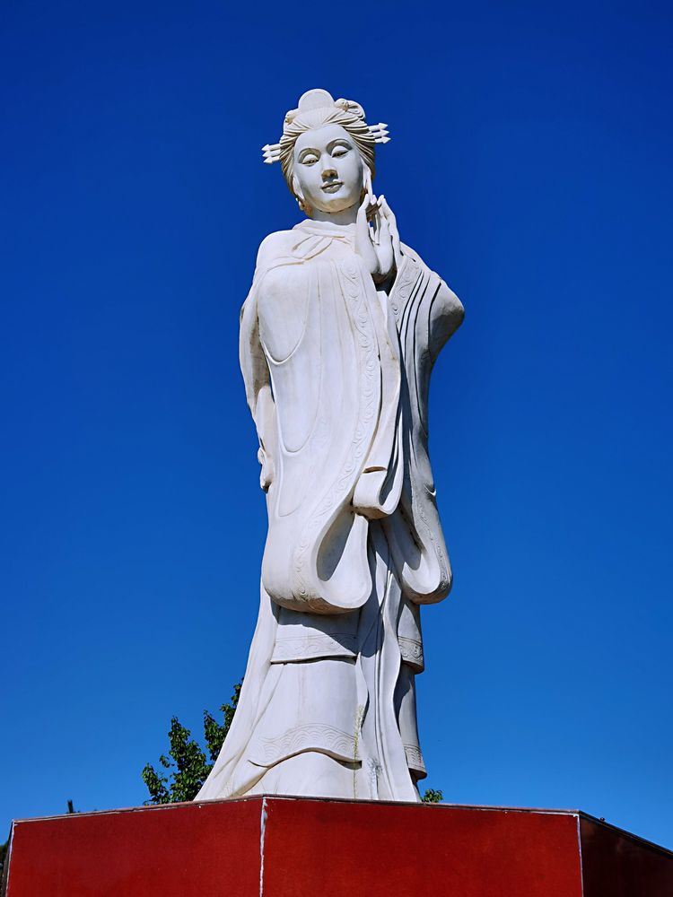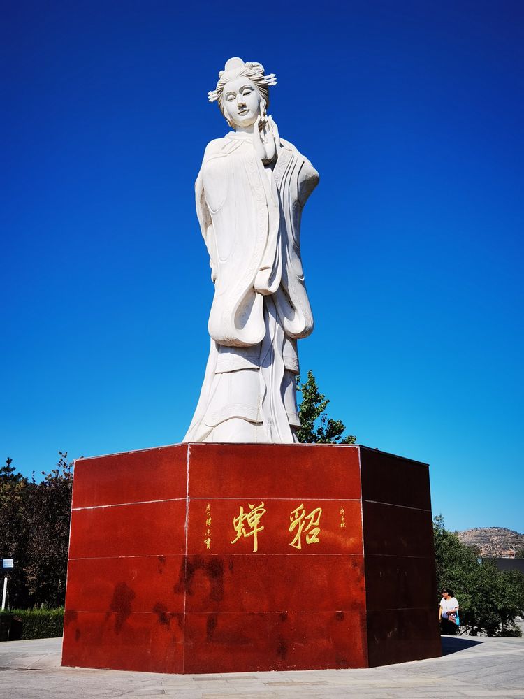 广场上的貂蝉,阔袖长裙,脸庞圆润,束发插簪,弯眉美目,双手成拜月状。让人想起诗经中“手如柔荑,肤如凝脂,领如蝤蛴,螓首蛾眉,巧笑倩兮,美目盼兮”的美女形象。