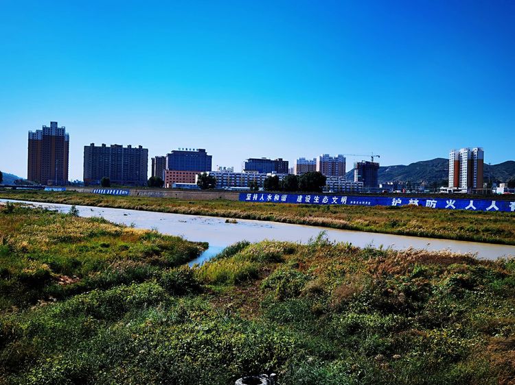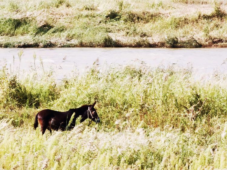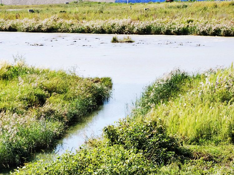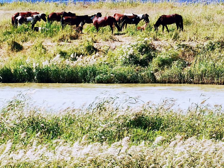 从滨河公园望向无定河,河面不宽,原本宽阔的河道大多被丛生的杂草遮盖了,有的地段还断流了。河道里一群马在悠闲地吃着草。