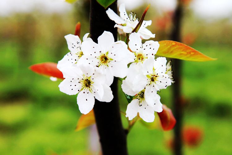到了梨花开时,忽如一夜春风来,千树万树梨花开。因梨园离我们家最近,早上起来,推开窗子,不由的眼前一亮,雪白的梨花似雪压冬林一样挂满枝头。一朵朵,一簇簇在春风中婆娑飞舞,怎一个美字了得!如果遇上下雨天,满园的梨花更是风情万种,那白色的花瓣晶莹剔透,宛若少女的皮肤,轻轻一弹,便要弹出水来。难怪古人用梨花带雨来形容女子的娇美呢。等梨花开过,苹果花就粉墨登场了。