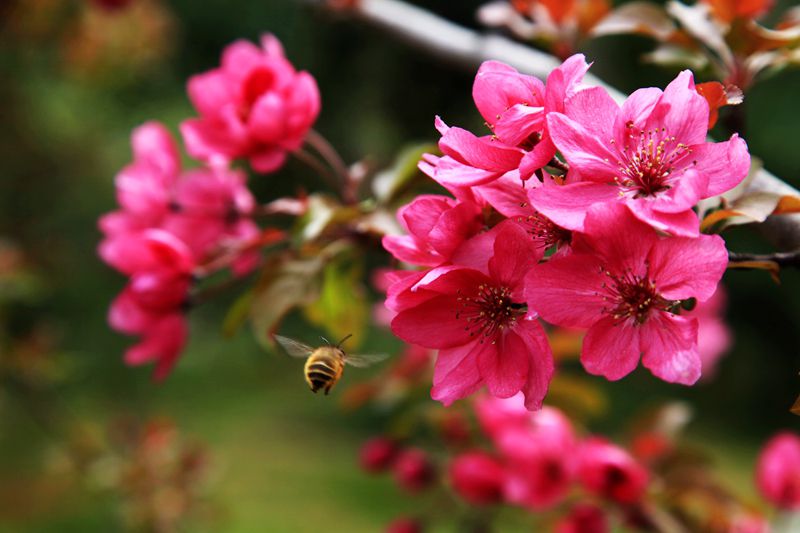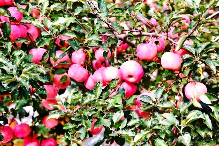 苹果花很漂亮,呈喇叭形状,素白色,清香淡雅。当花朵怒放的时候,会招蜂引蝶,招惹的蜜蜂嗡嗡飞来采蜜授粉,蝴蝶也忽扇着翅膀来助威。果园里,到处飞扬着悦耳的鸟叫虫鸣,到处飘荡着醉人的花香。这个时候,也是果农最忙碌的日子,他们要给果树授粉,还要疏果,定果,把密密麻麻的果子摘掉,让树上的果子疏密均匀。到了夏天,还要给果树打药、施肥。现在又多了一项任务,给苹果套纸袋,红富士苹果就是套上纸袋才红艳艳的。