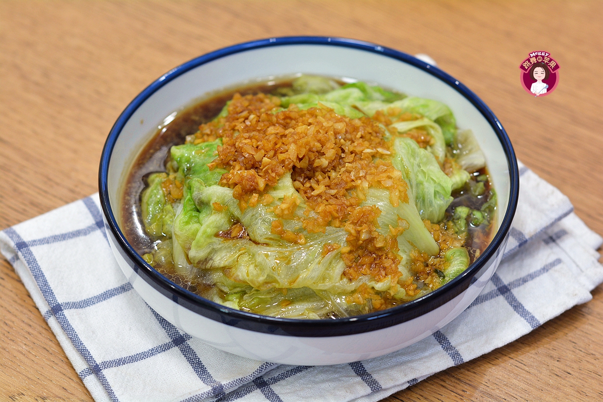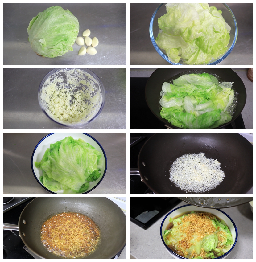 8. 将蚝油汁和蒜蓉倒在生菜上。
