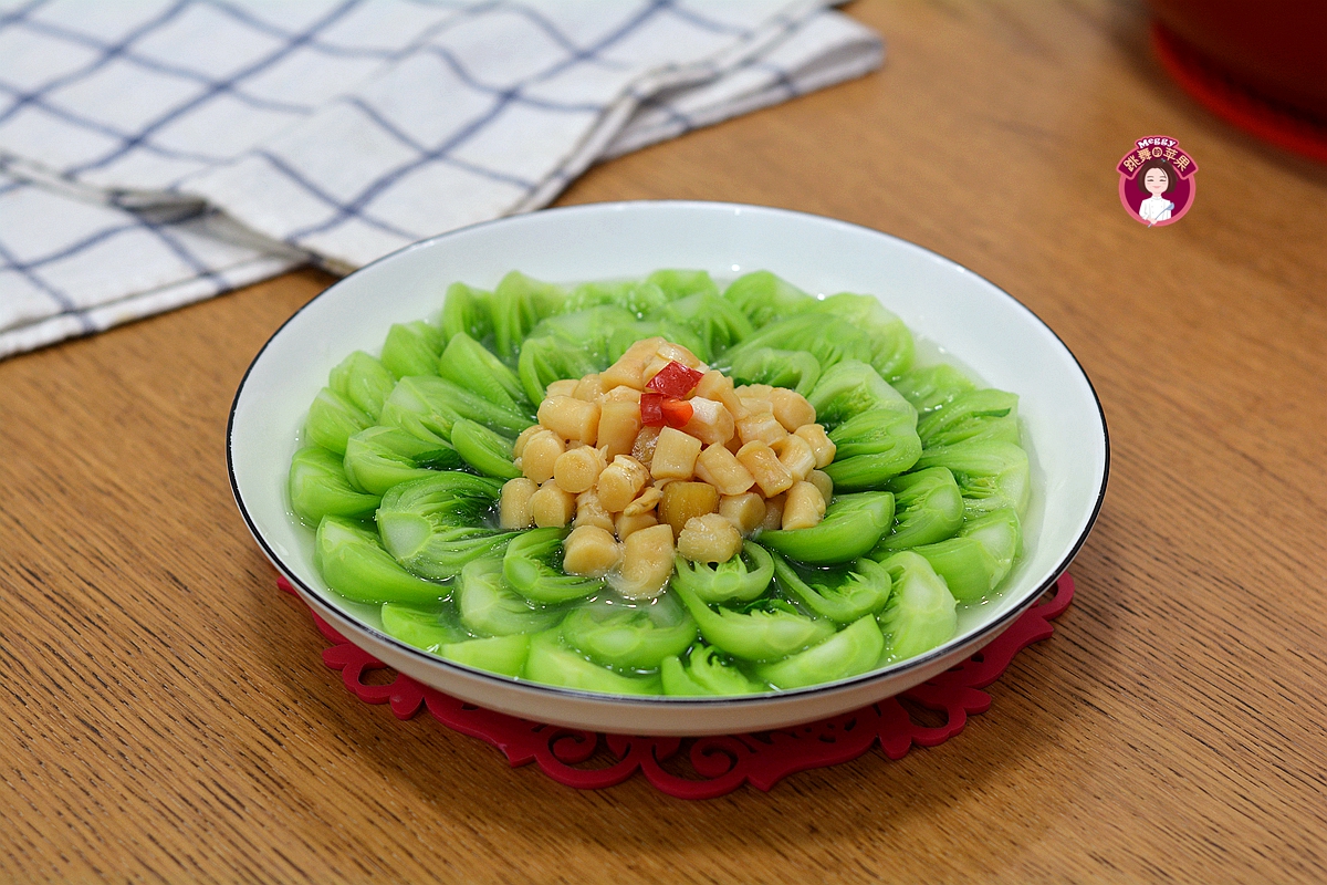 9. 将干贝倒在油菜中间处,芡汁淋在菜上,少许香葱末或者红椒丁点缀。