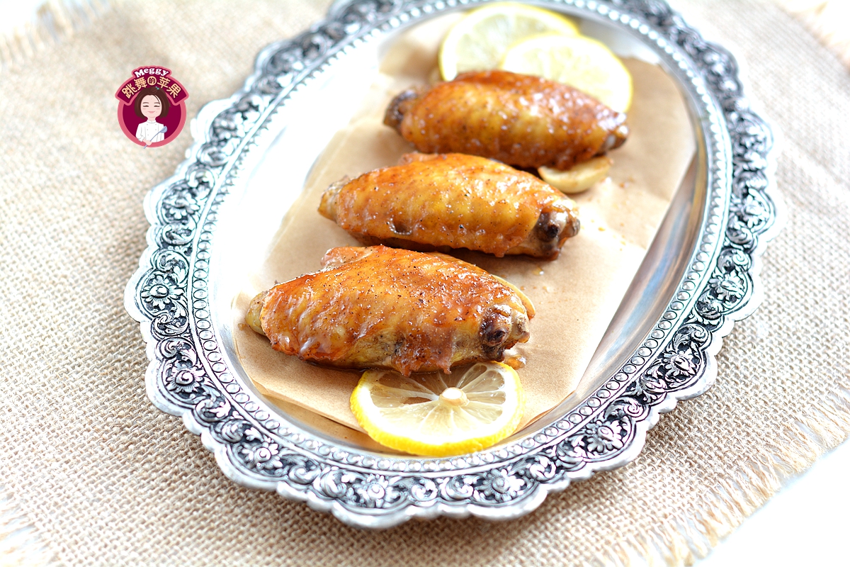 6. 出炉后,将事先切开的柠檬在每个鸡翅上挤几滴,香甜脆皮上有柠檬的清香。