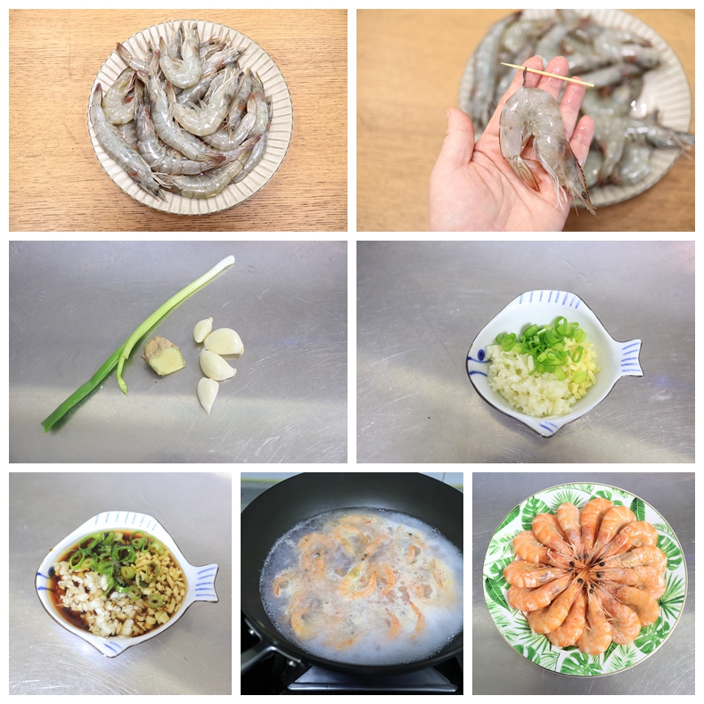 材料: 虾1盘,小葱1棵,大蒜4瓣,鲜姜1块,薄盐生抽15克,米醋15克