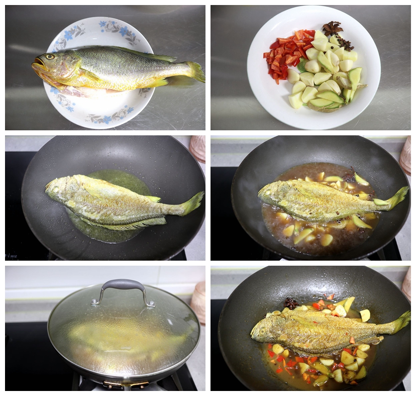 1. 黄花鱼肉嫩易碎,所以一定要将皮煎黄煎定型后再翻身,小火慢炖入味,可保持鱼型完整;