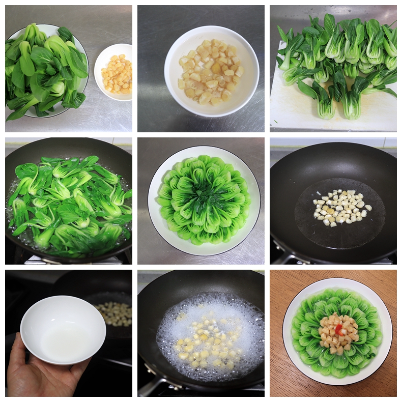 1. 油菜去掉老叶、削掉根部,干贝1碟;