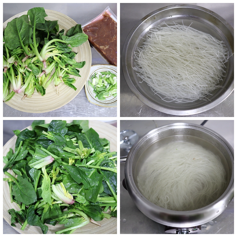 材料: 蚝油牛肉片300克,菠菜1把,红薯粉丝1把,青蒜1棵,盐少许,香油少许
