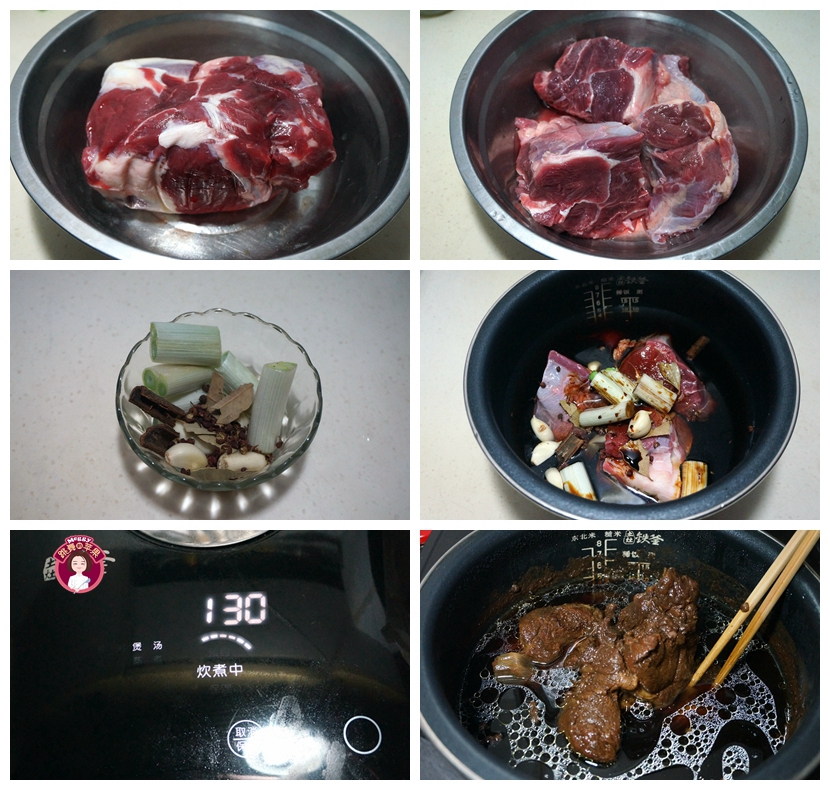 3. 牛腱子入电饭煲内胆中,将调料、香料全部入锅中,加够足够量的水;