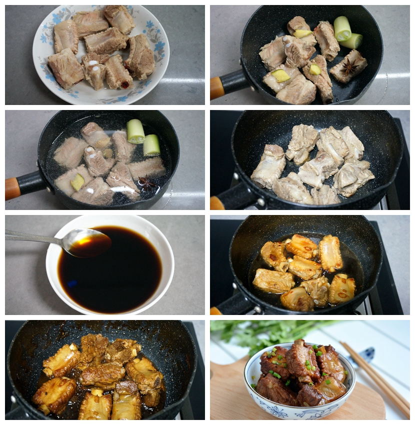 材料:排骨8块,大葱1段,姜1块,八角1颗,糖2勺,醋4勺,酱油5勺,盐半勺,凉水半碗(调汁)