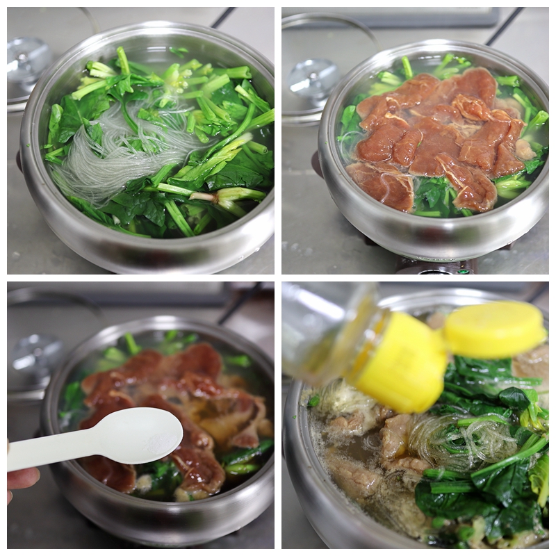 蚝油牛肉菠菜粉丝,有肉有菜,清爽可口,少油盐,调理过的牛肉非常嫩,粉丝滑溜溜,甭管是吃米饭还是纯喝汤,都是一道营养丰富的快手汤菜。