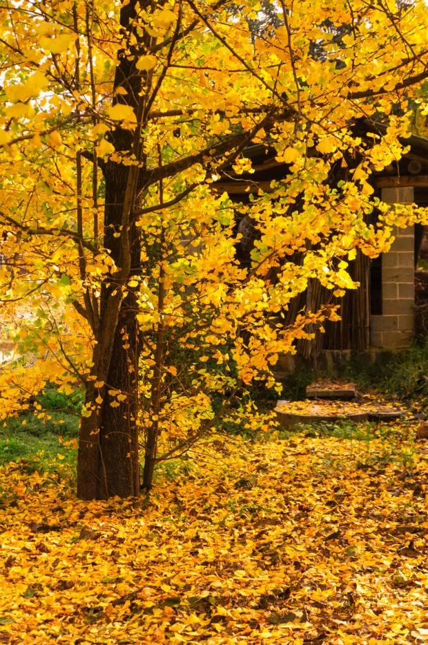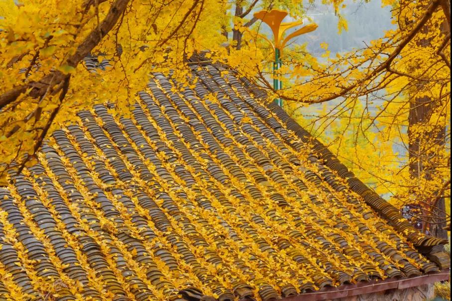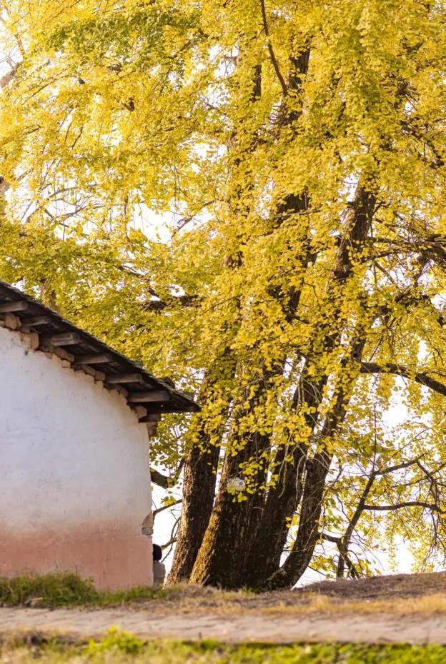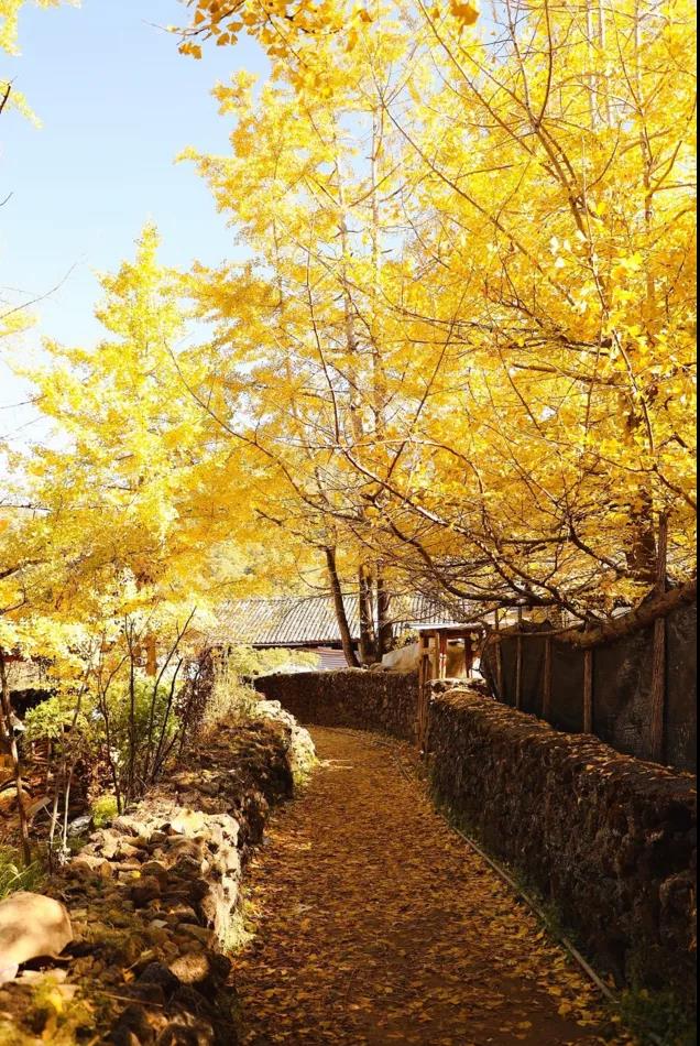 从11月中旬开始,小山村被高大的银杏树包裹得一片金黄,金色的“地毯”铺满村里的大小院落,走在小道上,让你沉醉不知归路。