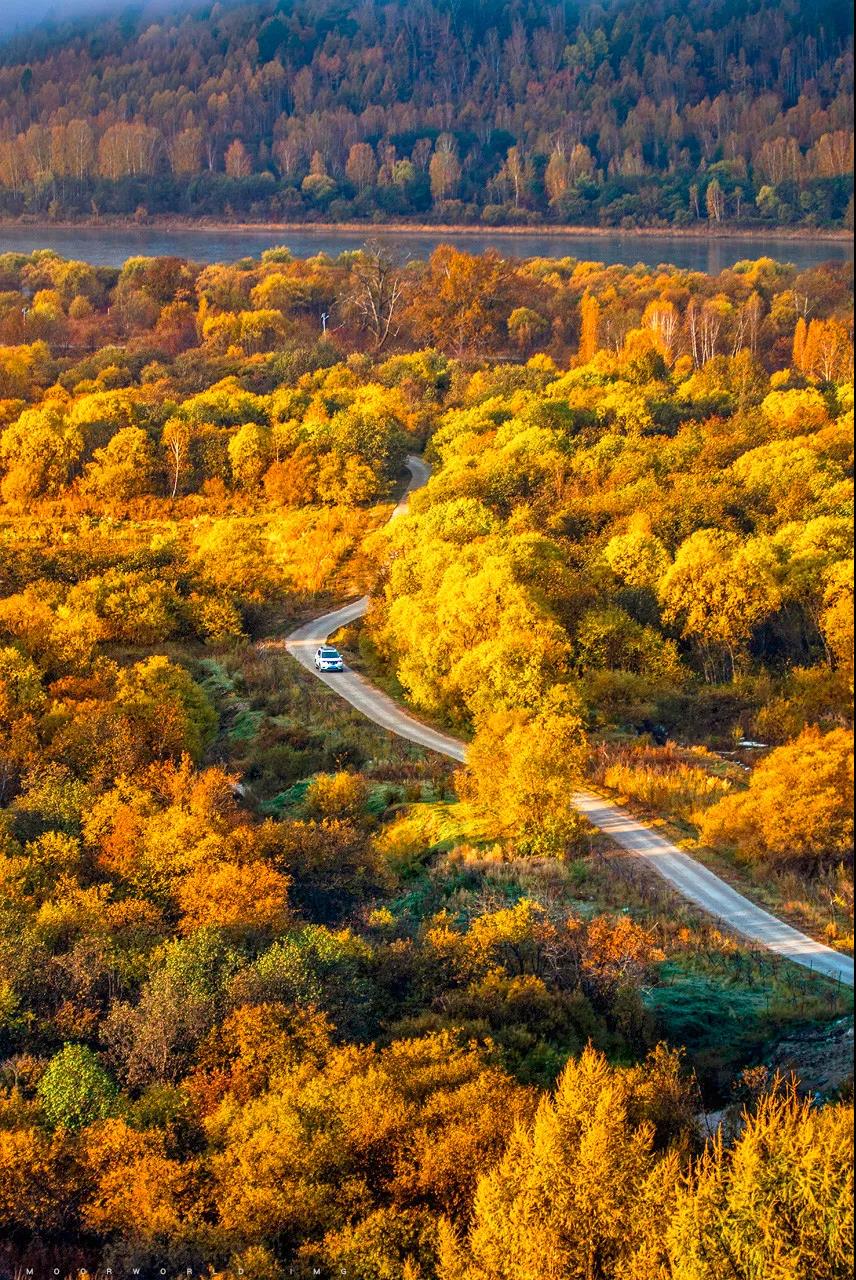 被秋色林海浸染了的额尔古纳河畔,是一幅幅绚丽迷人的油画。