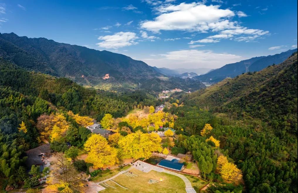 每年金秋,上百棵的银杏树披上了金黄外衣,在秋风的吹拂下,金黄的叶子像翩翩起舞的蝴蝶,在山林间飞舞。