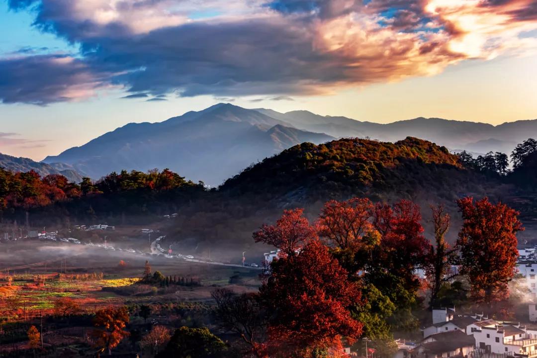粉墙黛瓦如水墨画般静素的单色,秋天到来后仿佛撞上了染色的颜料桶,浓重的色彩逐渐扩散开来。