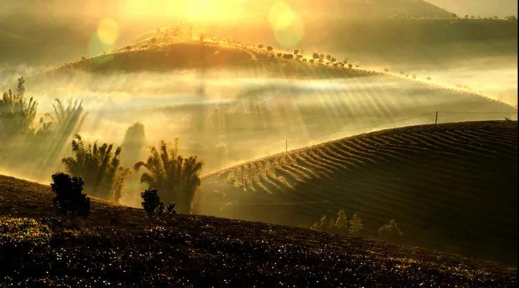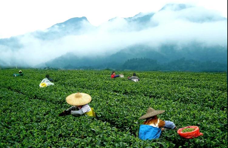 清晨,茶园烟雾云绕,茶尖经过露水的洗礼后,闪现着晶莹剔透的亮光,在黎明破晓的第一缕阳光下,看采茶工人开始一天的辛勤劳作。