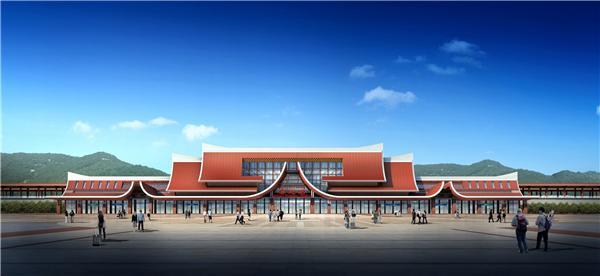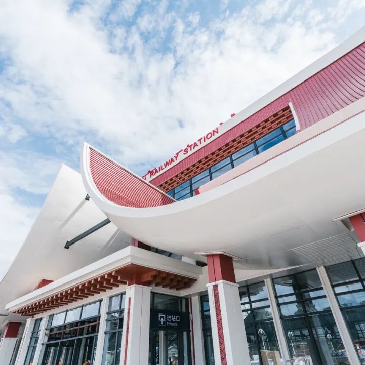 西双版纳站以“雀舞彩云,灵动版纳”为设计理念。屋顶造型沿用傣族传统建筑,端部起翘层叠挑出,如展翅的孔雀翩翩起舞,外立面采用花翎造型进行点缀,空灵飘逸,每处细节都彰显出民俗风情。