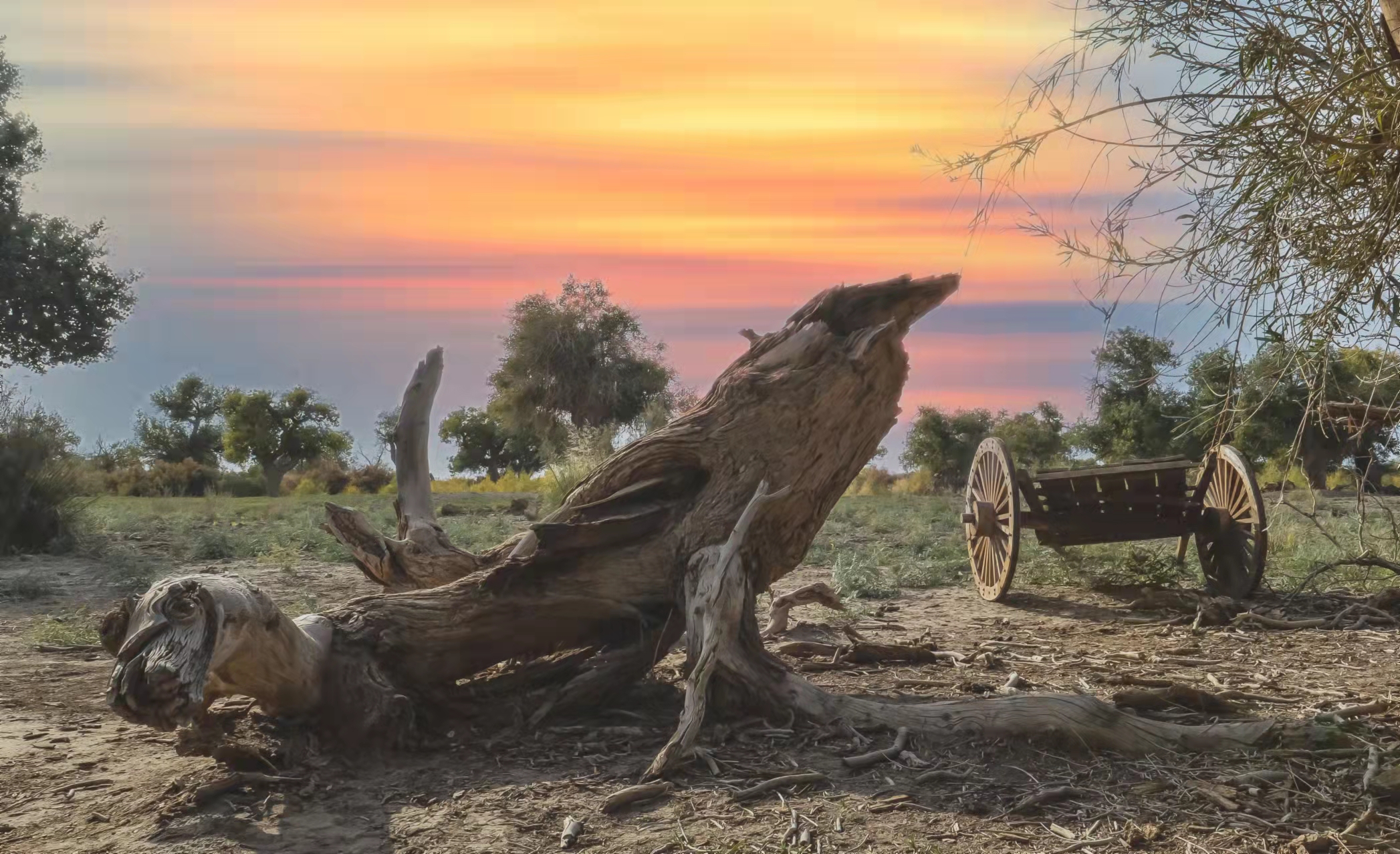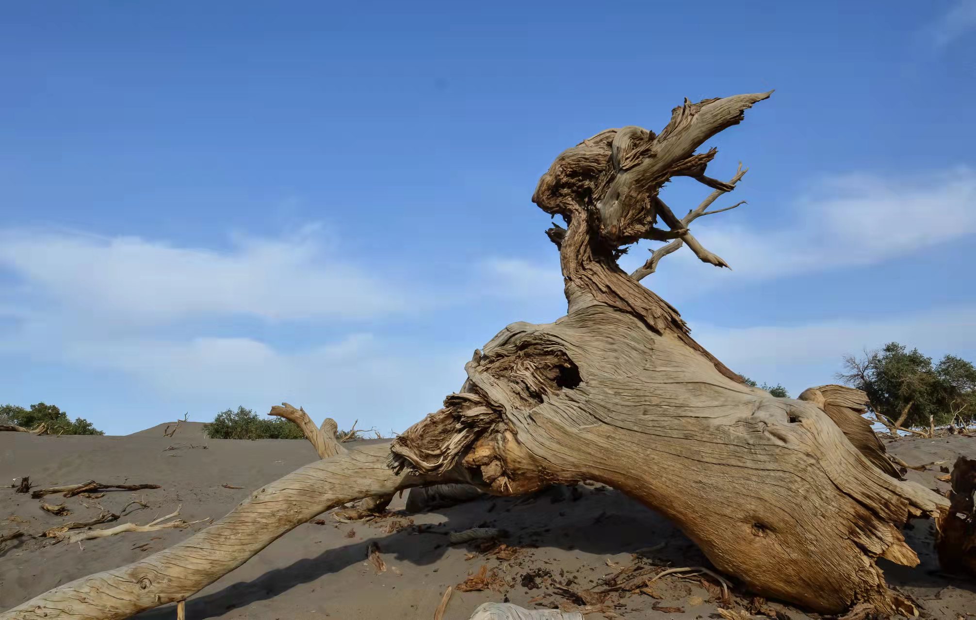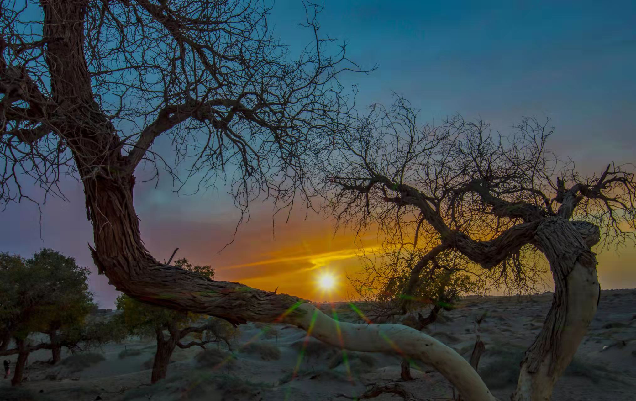 一半埋在沙漠里,另一半还伸着干枯的肢干挺着倔强脊梁,