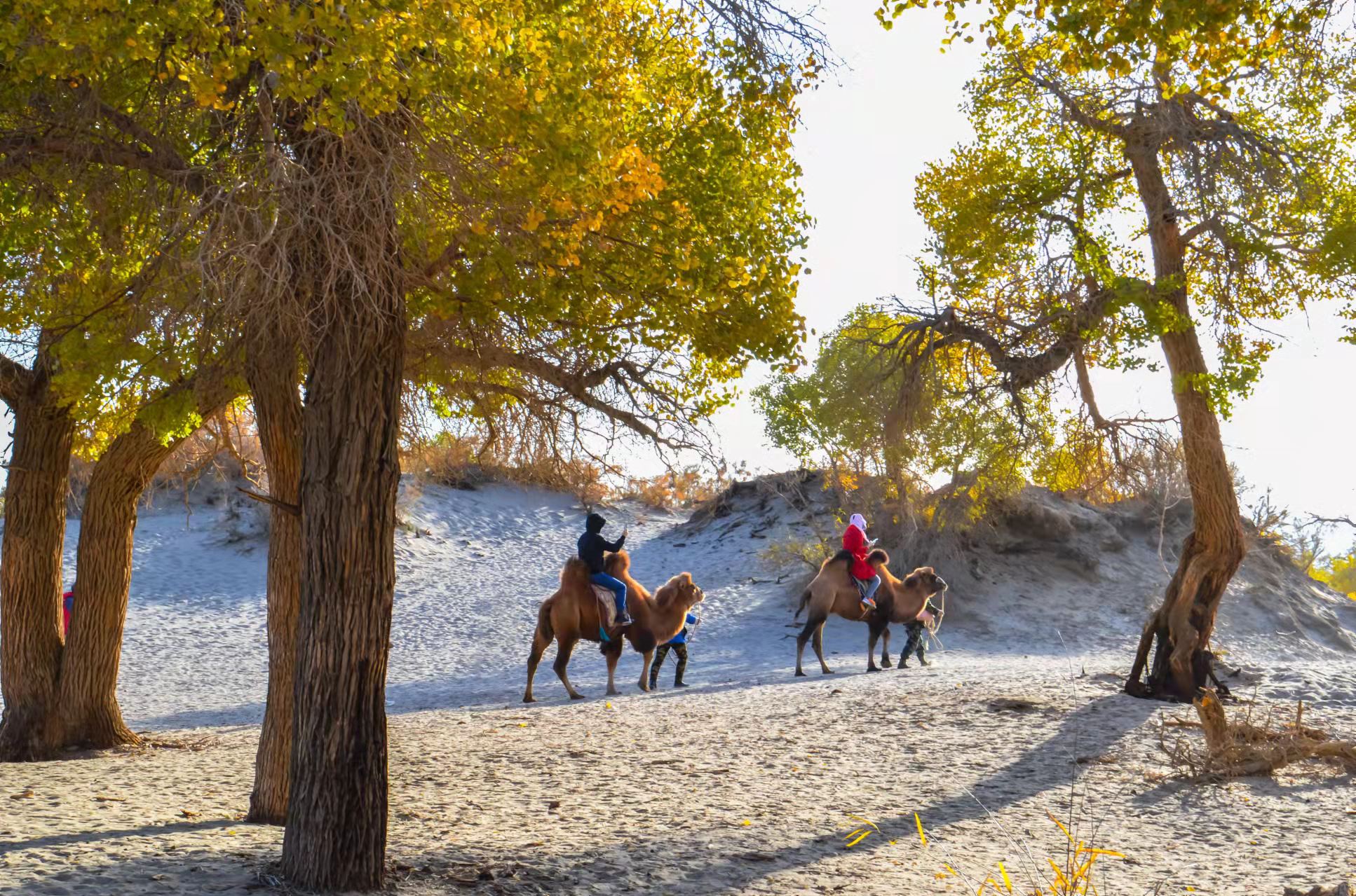 青春靓丽与苍劲的胡杨林如同一道美丽的彩虹,