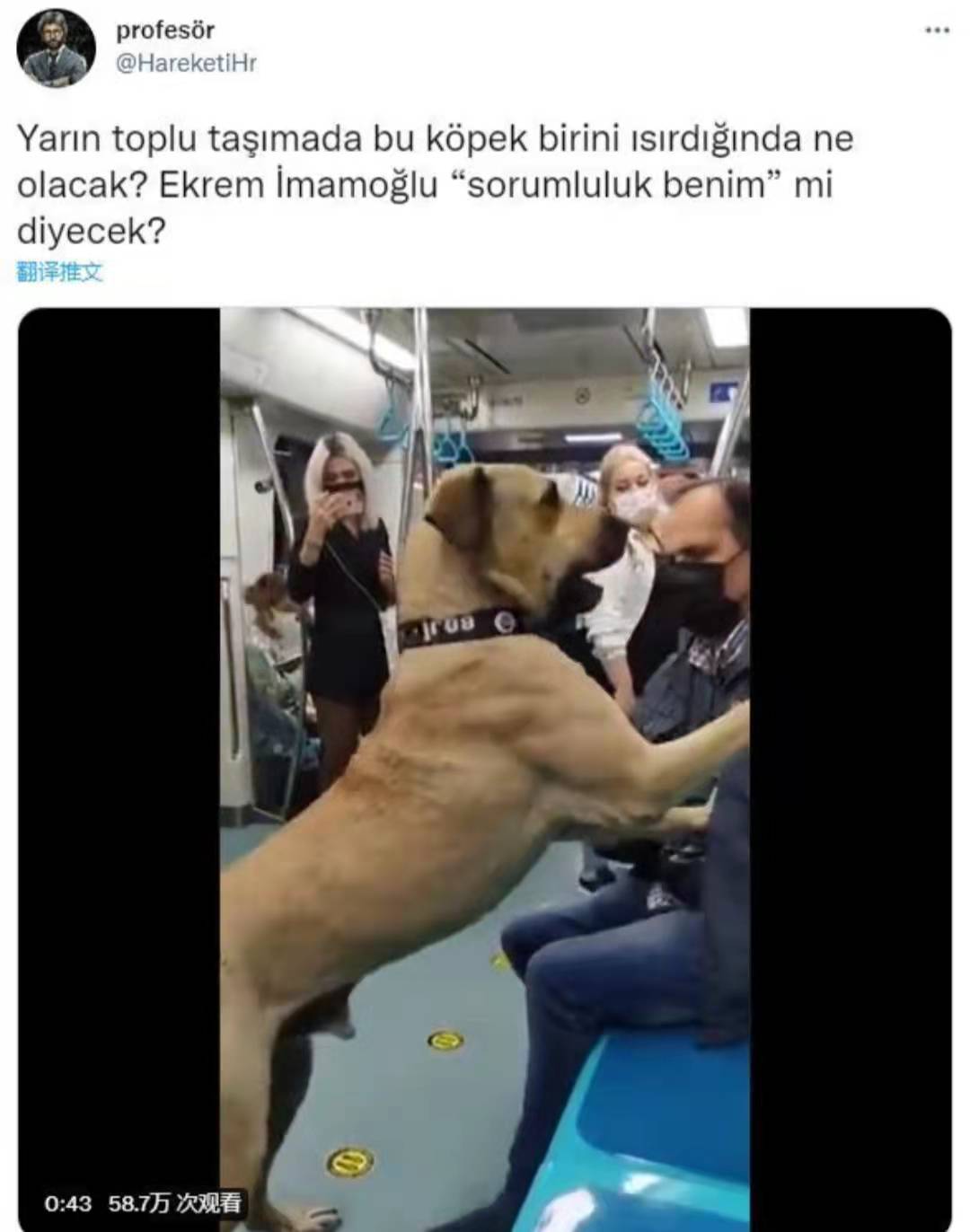 “如果这条狗明天在公共交通工具上咬人怎么办?Ekrem İmamoğlu(伊斯坦布尔市长)能承担责任吗?”