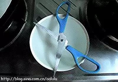 1.在灶台上放一满碗清水,最好放在两个火眼正中间,在碗上平放一把剪刀。