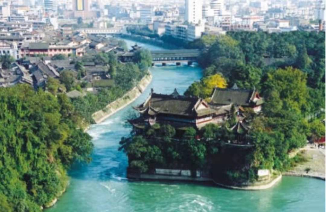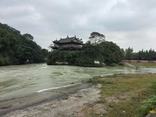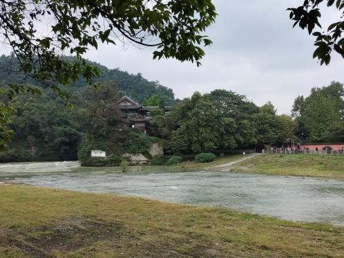 过江后,我们眺望对岸。对岸有一条河,劈开山谷,奔向成都市区。导游说,对岸那两山之间,就是宝瓶口。岷江是通过宝瓶口,把长江水引入了成都,这才使成都成了美丽富饶的风水宝地。
