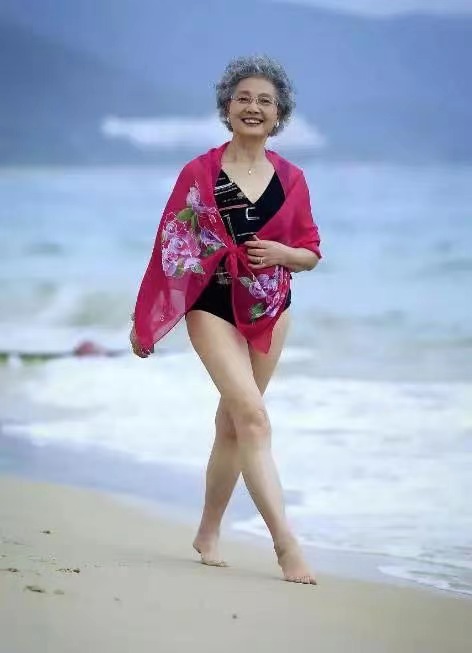 穿着泳装也丝毫不露怯,状态比很多小姑娘都好。