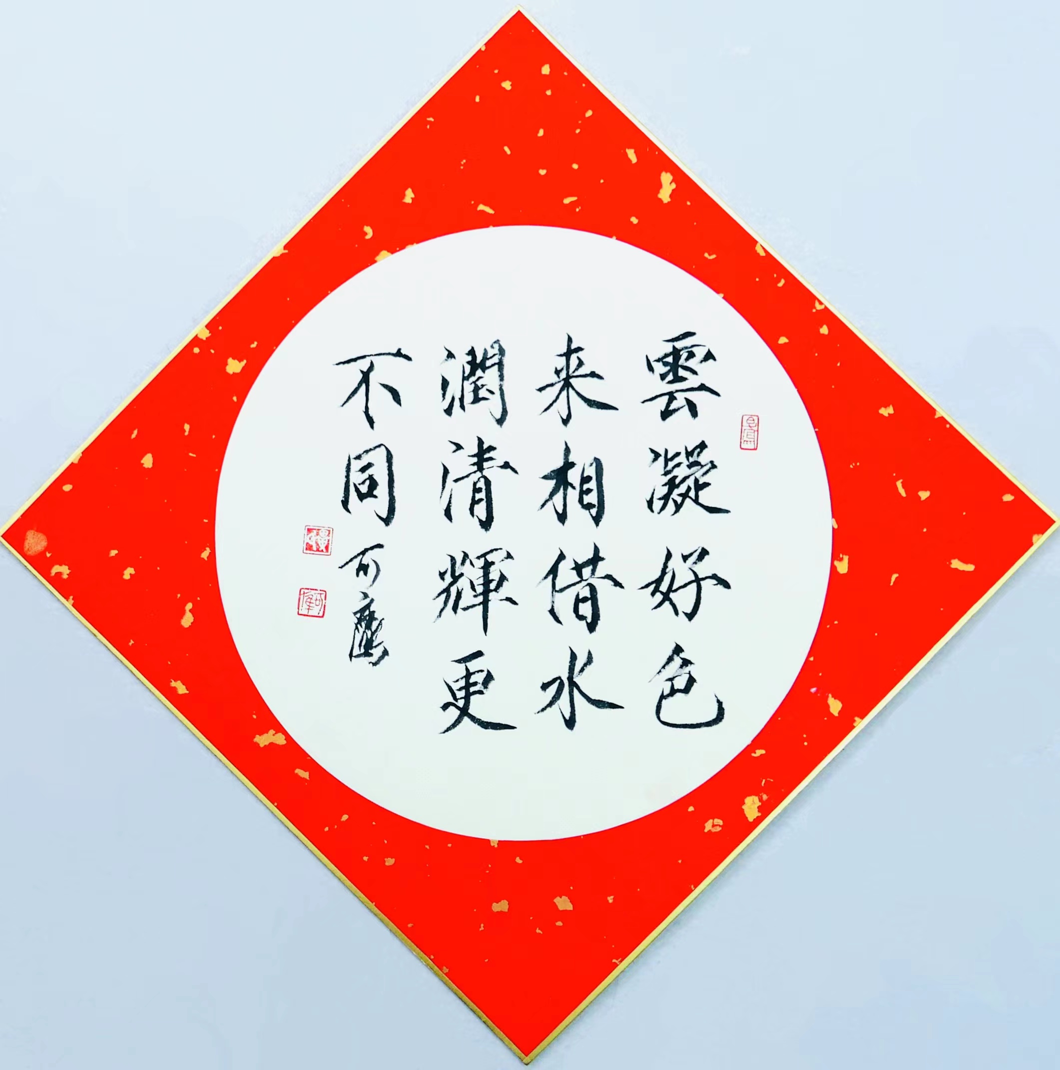 年味儿越来越浓了,取“明月斗方”,菱形构图,写瘦金体对仗诗句: