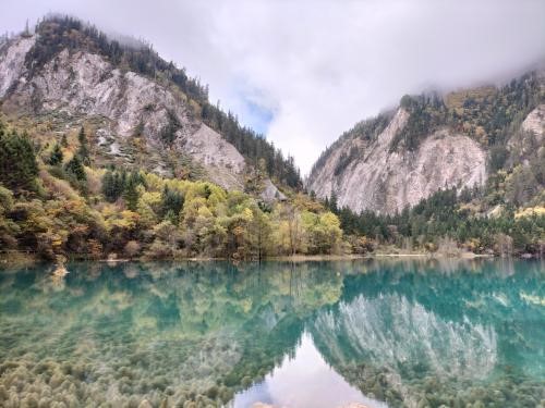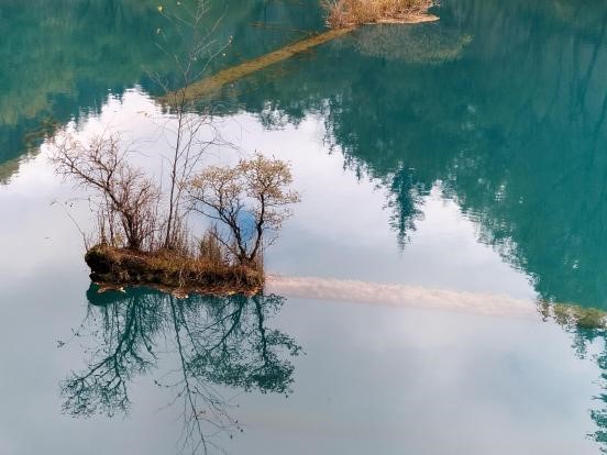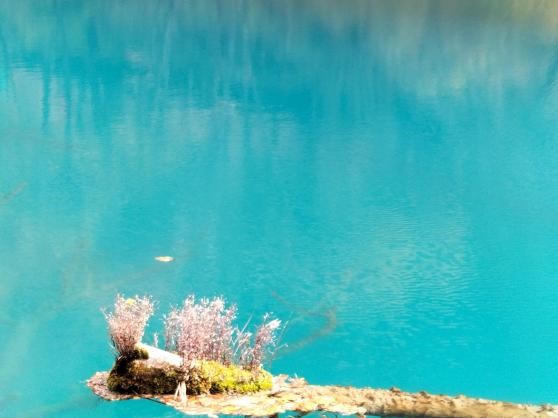 九寨沟的风景是一湖一世界,每一处都有每一处的美景,你要说是美不胜收,那是一点也不为过。有的时候,那无穷无尽的变化,使你感到目不暇接。就是树,也几乎到了一树一世界的景象。树站着,挺拔,像个男子汉一样,顶天立地。就是躺在水里,那也是别有一番天地。你看这湖里就躺着一棵树,那树根也许吸附了一些泥土,形成自己的一片新天地,上面还生长出几簇草丛。在草茎里,还生长出粉粉的茄紫色的花穗,非常的艳丽,诱人。一只浑身生长着宝石蓝羽毛的小鸟,恰在这时飞落在两簇草丛之间小憩,她左瞻右顾,可爱极了。这是她的天国吗?还是她的家?我真想问问她,可惜,她飞走了。