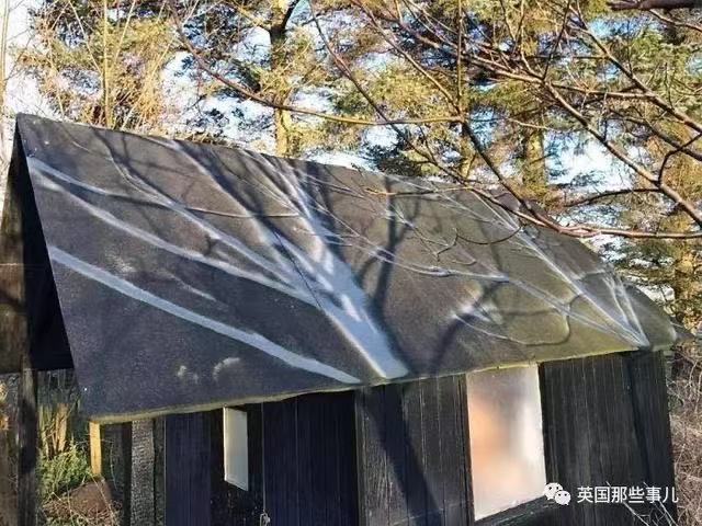 太阳升起,小雪消融,地上、屋顶上出现了白色树影。