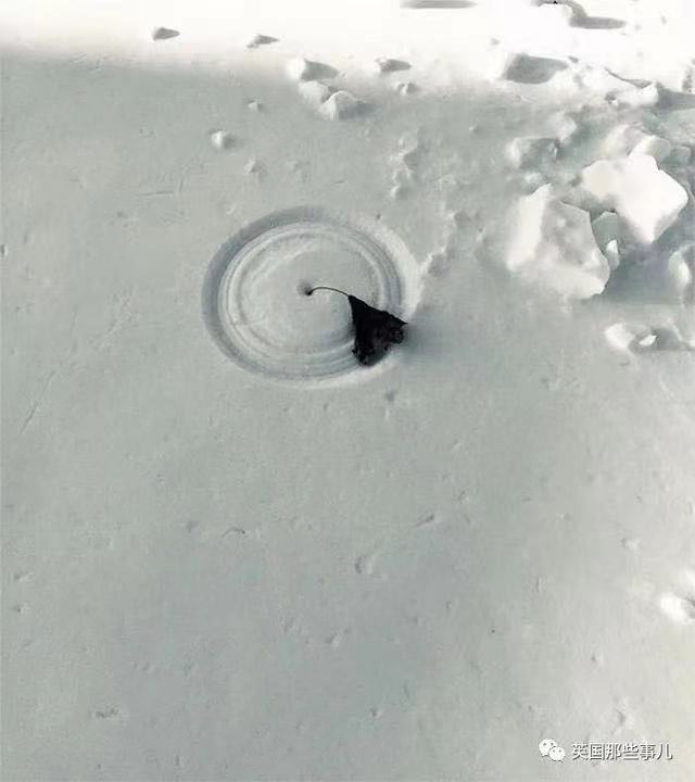 一片冰冻的落叶,在雪地里画了完美的圆圈。
