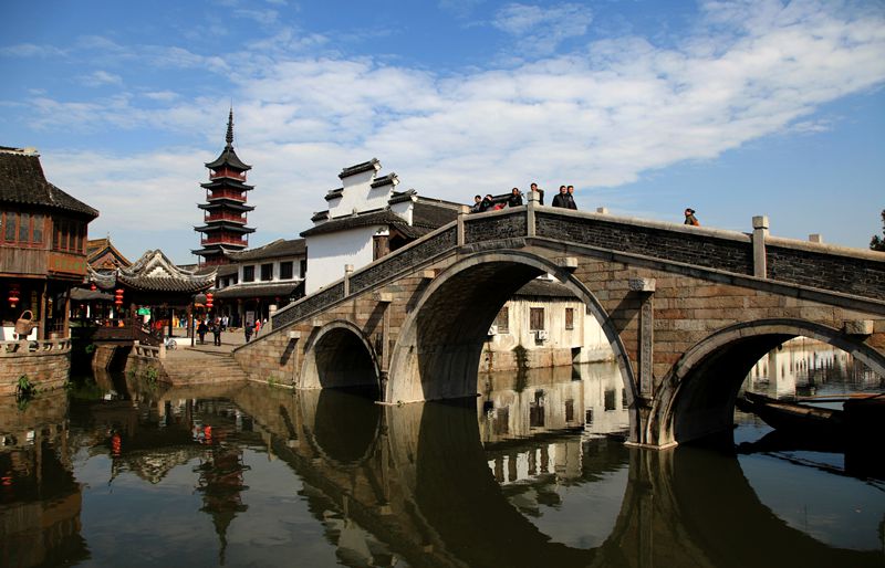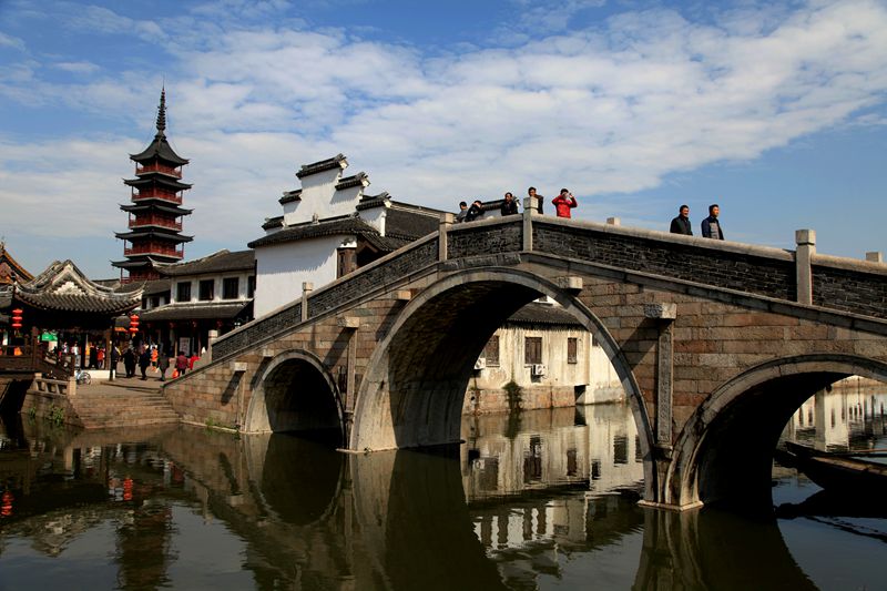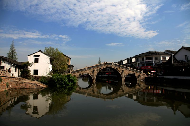 进入千灯古镇必须要跨过三座桥,这三座连袂的桥有个美丽的名字叫“三桥邀月”,之前我看过千灯的资料,这三桥分别代表了宋、明、清三个不同的时代。东边的小桥叫方泾兵桥,是明代建筑,中间三孔石桥叫恒升桥,是清代建筑,西边小巧玲珑的木桥叫鼋渡泾桥,是宋代的建筑。桥下的河叫方泾浜河。