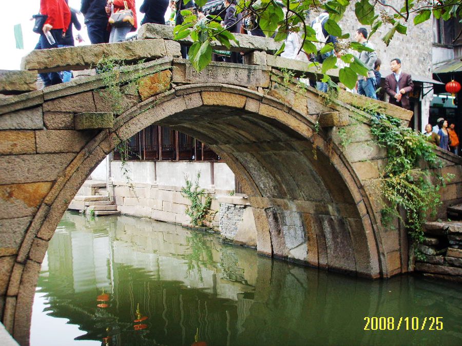 我跟着旅行团到了周庄,见到了那个砖雕门楼,我想起女儿在这里拍过照,我请别人帮忙,也在这个位置留了张影。后来跟着导游穿桥过巷,记忆里都是攒动的人头。在陈逸飞画下的双桥上,我差点被挤倒。只好站在桥下拍了张照片,因为女儿也在这里留过影。旅行团的导游蛮好的,滔滔不绝的给我们讲解,只是我心里乱糟糟的,什么也听不进去。就这样稀哩糊涂游完了周庄。