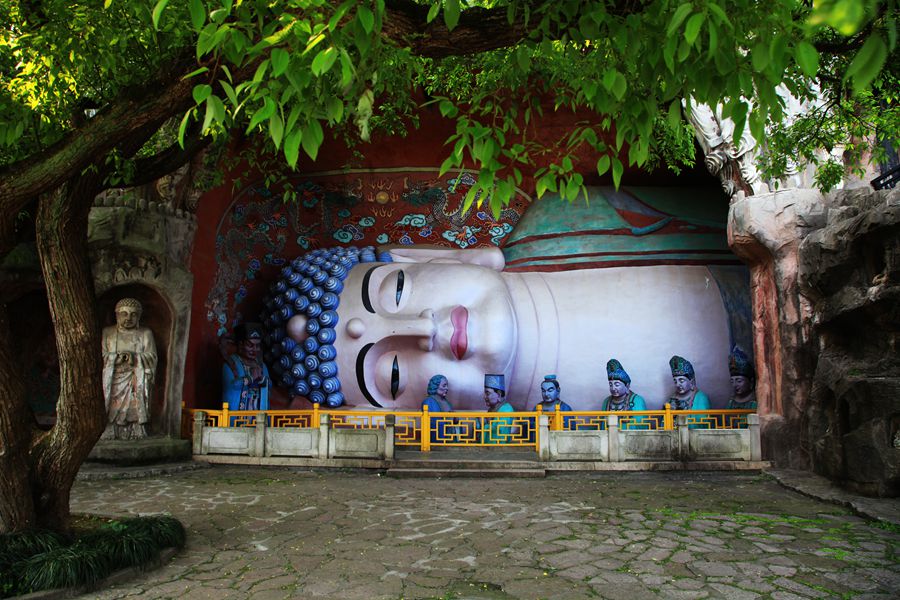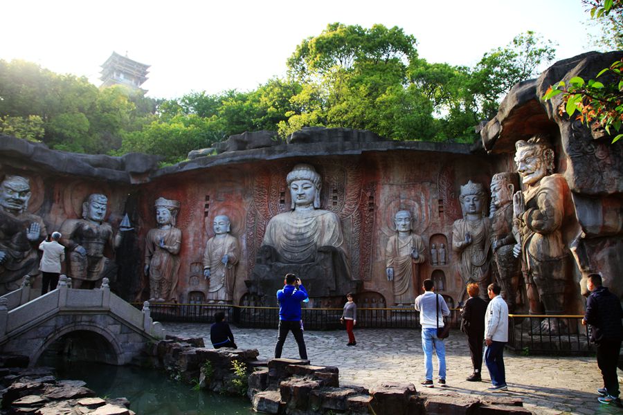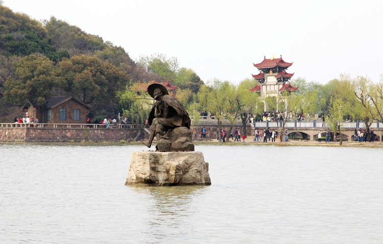 看完鼋头渚的樱花和人文景观,可乘船登太湖仙岛一探秘境。20分钟的水程,可感受到太湖烟波浩渺之美。下了船,走下码头,一溜长廊连着会仙桥。去岛上,先从桥下过,返程才可登会仙桥。因为过了桥就是仙人了。岛上风光旖旎,有道教仙宫和佛教石窟塑像。还有月老祠,情侣们在此祈福,愿美好姻缘一线牵。湖中还有个老渔翁雕塑,带着草帽,甩着渔杆,惟妙惟肖的样子,让我想起了一句歇后语,姜太公钓鱼愿者上钓。